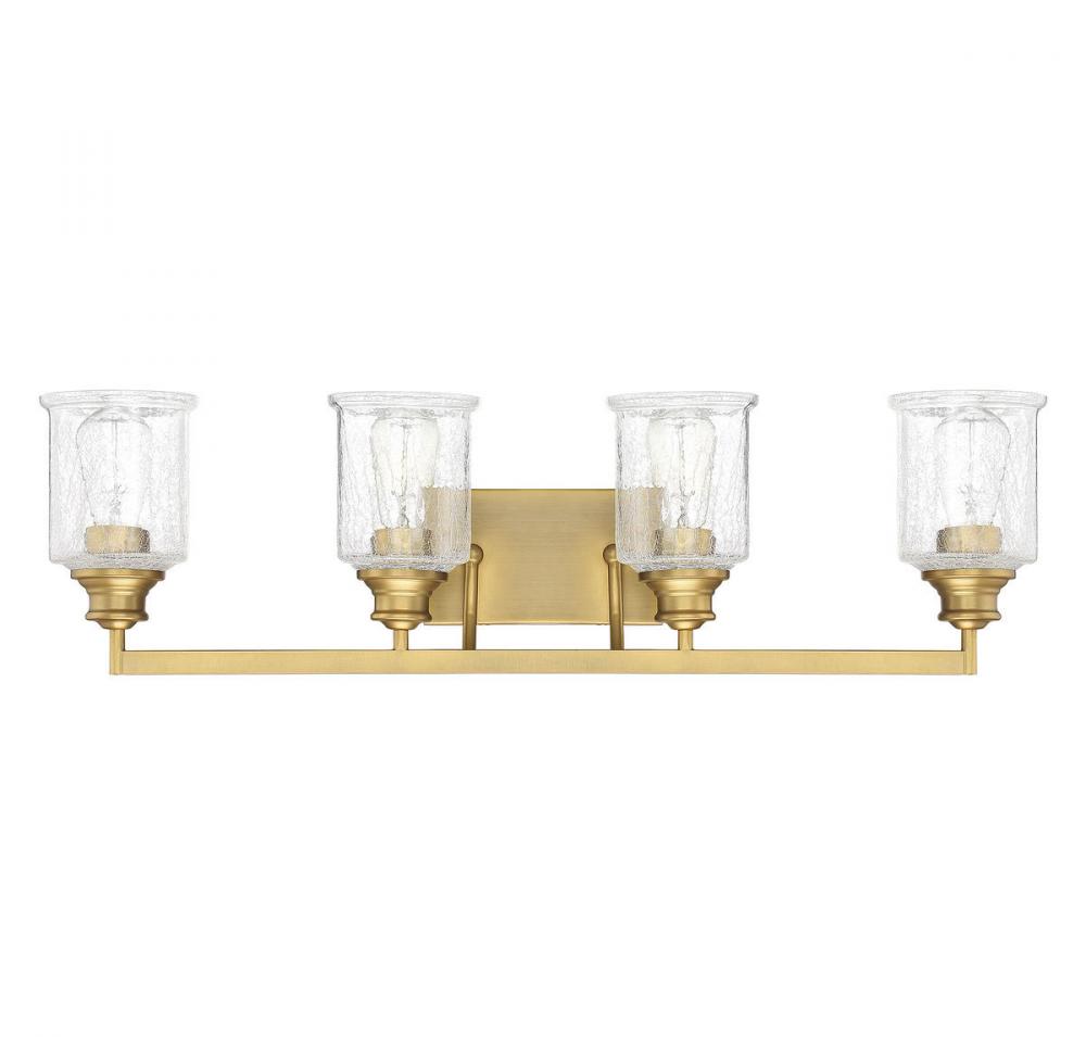 Stunning shades of thick clear crackle glass are the stars of the Savoy House Hampton 4-light bath bar. So as to let the stars have center stage, the restof the structure is kept deliberately understated, making it perfectly versatile for many different bathroom decor styles. Offered in a rich warm brass finish. This fixture is 32" wide and 8.75" tall. It extends 6.5" from the wall. Uses 4 standard size bulbs of up to 60 watts each (not included).