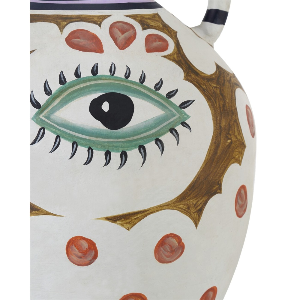 Made of terracotta with vibrant glazed motifs on the matte surface, the Hamsa Demijohn Vase is a colorful riff on the ancient Middle Eastern amulet symbolizing protection and happiness. Bringing the token into the modern day, the colorful contemporary rendering will draw attention in any space. The multicolored decorative jug will be a definite conversation-starter, as it was inspired by Picasso and celebrates Mediterranean culture during the 1940s.