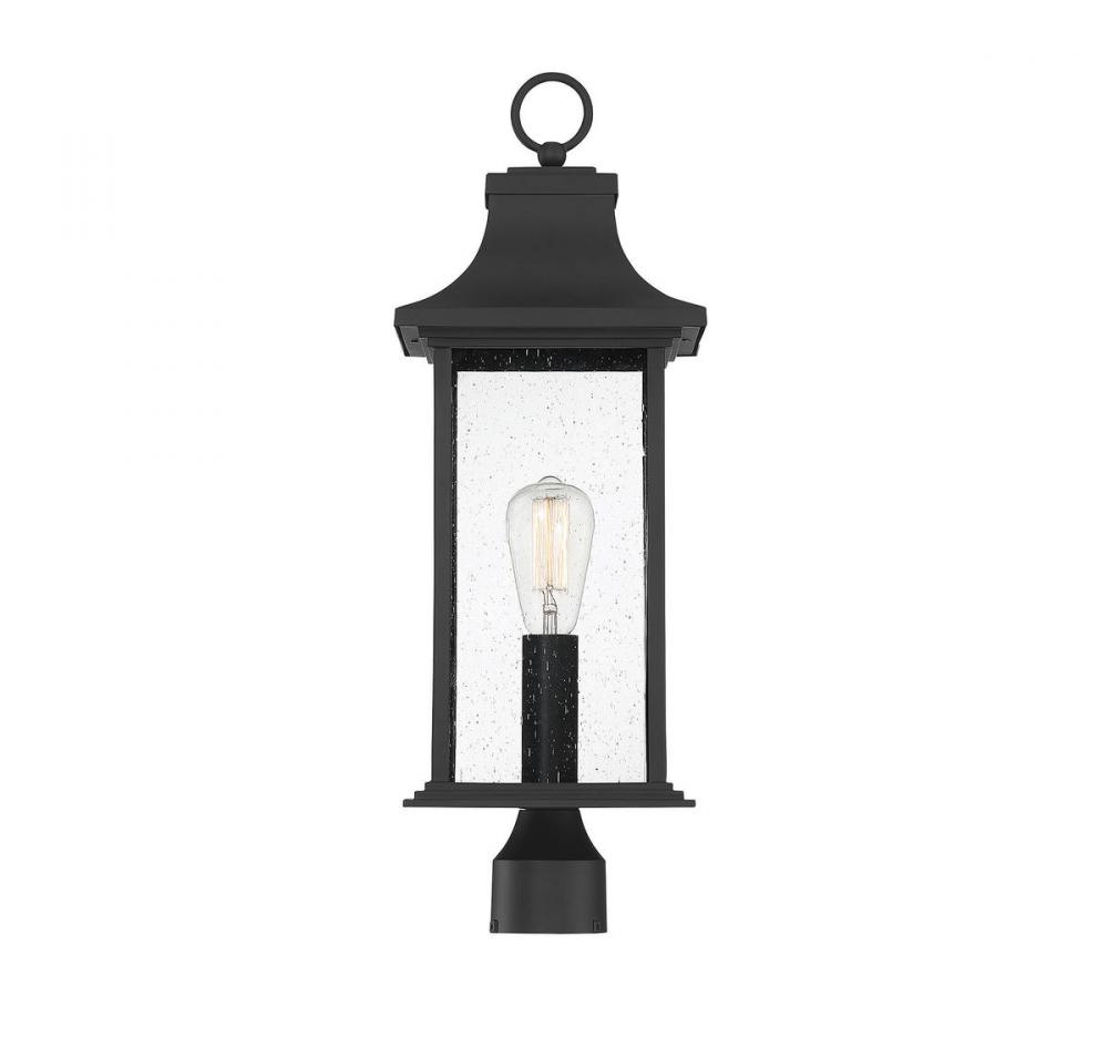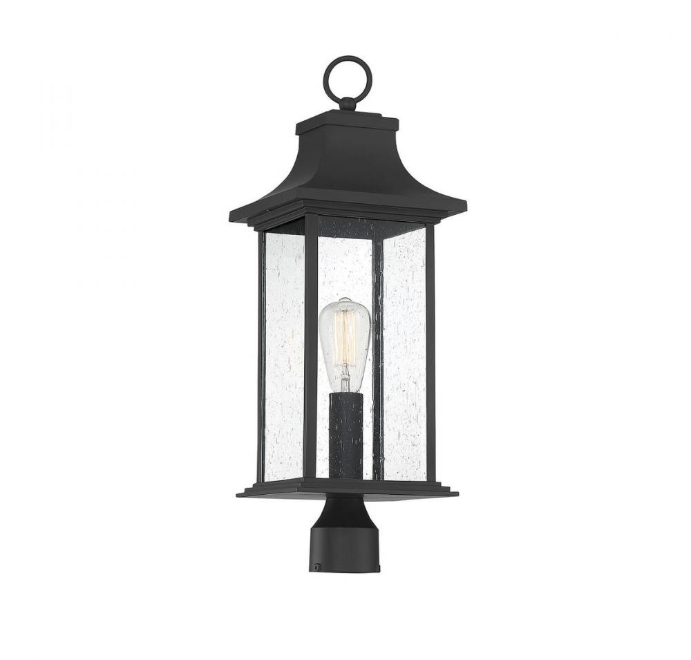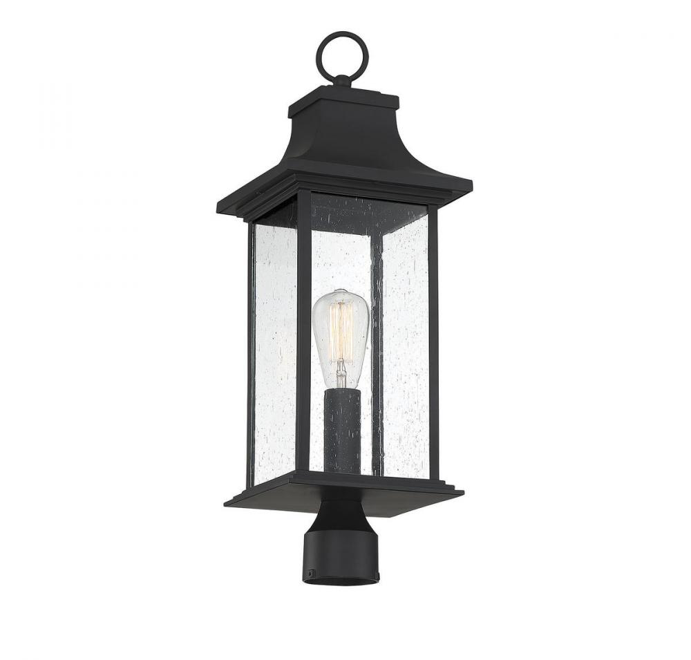 Create a stylish first impression outside your home with this Savoy House Hancock 1-light outdoor post mount lantern. Crafted in a timeless classic style, it features a boldly sloped roof, a large circular chain link and panes of clear seeded glass that ensures a beautiful, dramatic glow. The versatile black finish means that Hancock goes well with anything. Use this post light to mark the start of your driveway, to illuminate stairs outside your home, to brighten up outdoor living spaces and more. This fixture is 8.5" wide and 24.25" tall. It fits posts and pier mounts that are 3" in diameter. Uses a standard size bulb of up to 60 watts (not included).