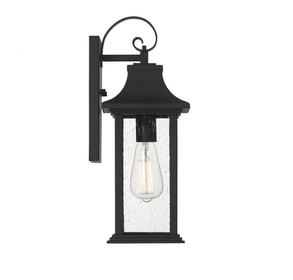 Create a stylish first impression outside your home with this Savoy House Hancock 1-light outdoor wall lantern. Crafted in a timeless classic style, it features a boldly sloped roof, shepherdï¾’s hook detailing and panes of clear seeded glass that ensures a beautiful, dramatic glow. A generously sized backplate helps to cover any holes left from replacing previous fixtures and the versatile black finish means that Hancock goes well with anything. Use this lantern beside your front and side doors or above your garage door. This fixture is 6.75" wide and 17.5" tall. It extends 7.5" from the wall.Uses one standard size light bulb of up to 60 watts (not included).