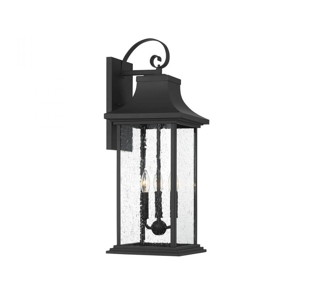 Create a stylish first impression outside your home with this Savoy House Hancock 3-light outdoor wall lantern. Crafted in a timeless classic style, it features a boldly sloped roof, shepherd’s hook detailing and panes of clear seeded glass that ensures a beautiful, dramatic glow. A generously sized backplate helps to cover any holes left from replacing previous fixtures and the versatile black finish means that Hancock goes well with anything. Use this lantern beside your front and side doors or above your garage door. This fixture is 10.5" wide and 27.75" tall. It extend 10.5" from the wall. Uses 3 candelabra size bulbs of up to 40 watts each (not included).