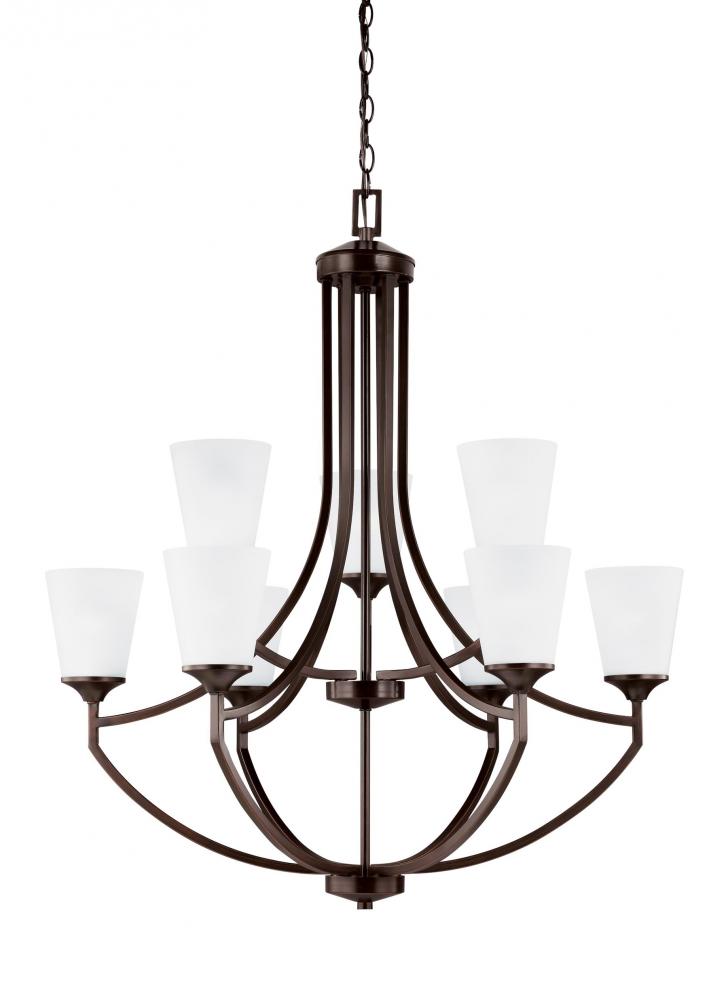 The Hanford nine light multi-tier chandelier in bronze is an ENERGY STARĀ® qualified lighting fixture that uses LED bulbs to save you both time and money. The transitional styling of the Hanford lighting collection by is evident in its elegant symmetry articulated by long, sweeping arms. Tapered Etched glass shades produce a soft up light and make Hanford complementary to a wide array of decor from traditional to contemporary. Offered in both Brushed Nickel and Burnt Sienna finishes, the collection includes five-, nine- and fifteen-light chandeliers, a three-light hall/foyer light, a one-light mini pendant, a three-light pendant, a three-light semi-flush mount which can convert into a pendant, and one-, two-, three- and four-light bath fixtures. Incandescent and ENERGY STAR-qualified LED lamping are available; all fixtures are California Title 24 compliant.