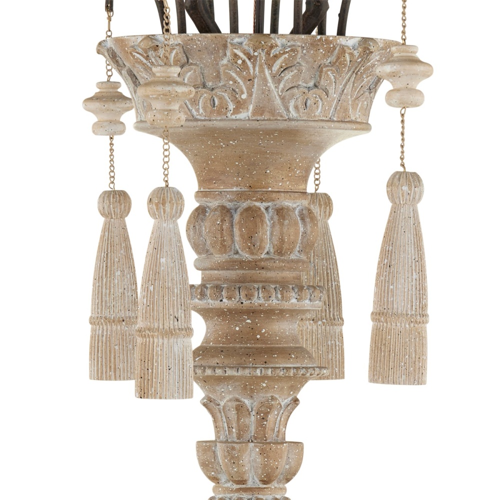Our Hannah Large Chandelier has a delicate profile. Its hand-carved accents, evocative of turned wood, are more graceful with our Stockholm white finish applied. The scalloped wrought-iron frame in a rust finish brings aged beauty to this white chandelier. Adjustable from 69" to 136" with use of included chain/rod kit/cable. If your space calls for a longer drop, additional chain/rods/cable is available for purchase.