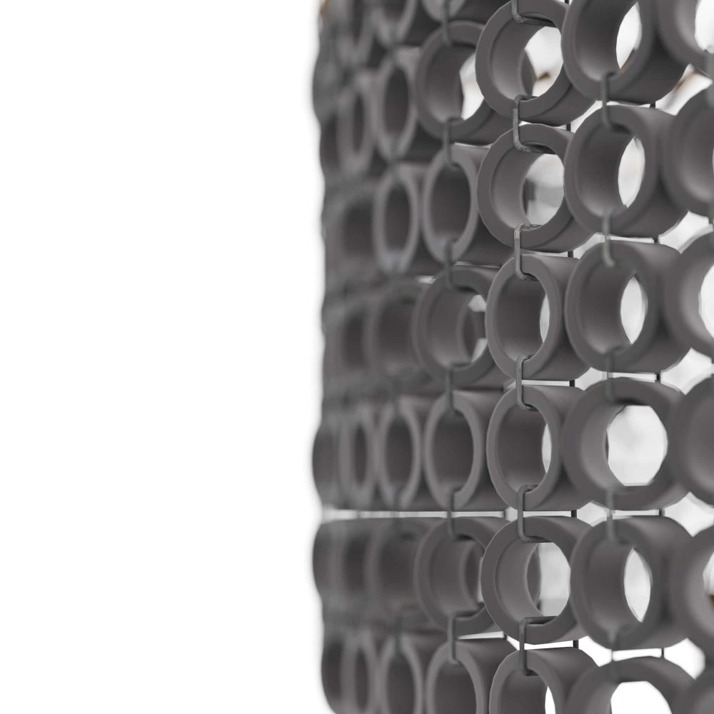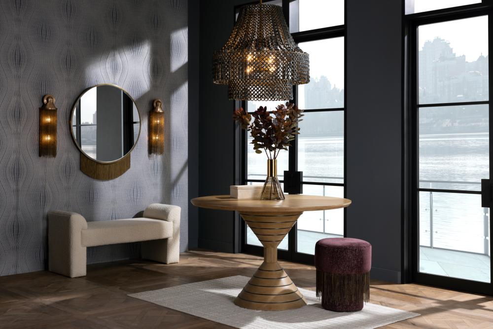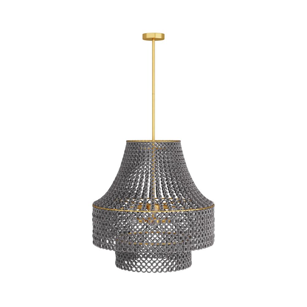 ITS OVERSIZED SCALE MAKES THE HANNIE CHANDELIER THE ULTIMATE STATEMENT PIECE. A BEADED, GRAY WASH BEECHWOOD EMPIRE SILHOUETTE LAYS THE FOUNDATION FOR CREATIVE DETAILING, INCLUDING HAND-CARVED CIRCULAR BEADS THAT LAYER TO DIFFUSE LIGHT THROUGHOUT A SPACE. THE TEXTURAL PIECE SUSPENDS FROM AN ANTIQUE BRASS IRON PIPE. FINISH WILL VARY.