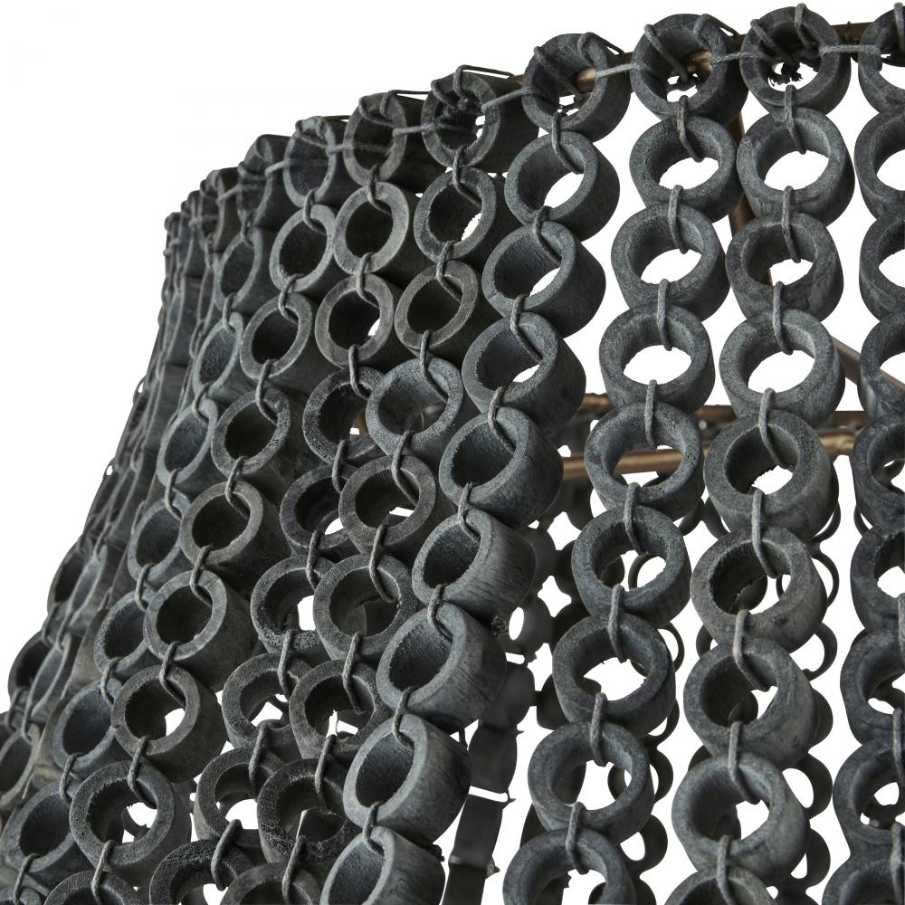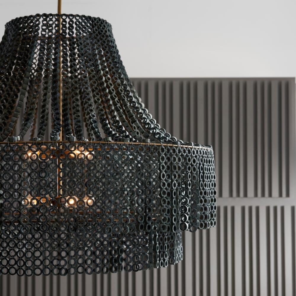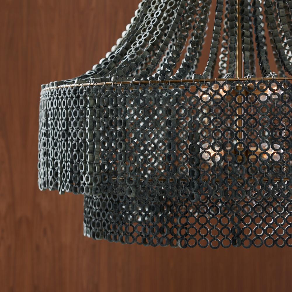 We updated the classic Hannie in a super-sized scale for extra impact, assuring it will be the ultimate statement piece. A beaded, dark gray wash Beechwood empire silhouette lays the foundation for creative detailing, including hand-carved circular beads layered to diffuse light throughout a space. This textural style suspends from an antique brass-plated iron pipe. Finish will vary.