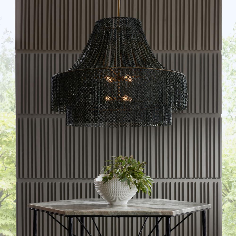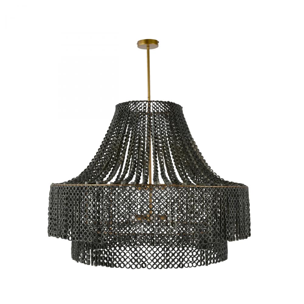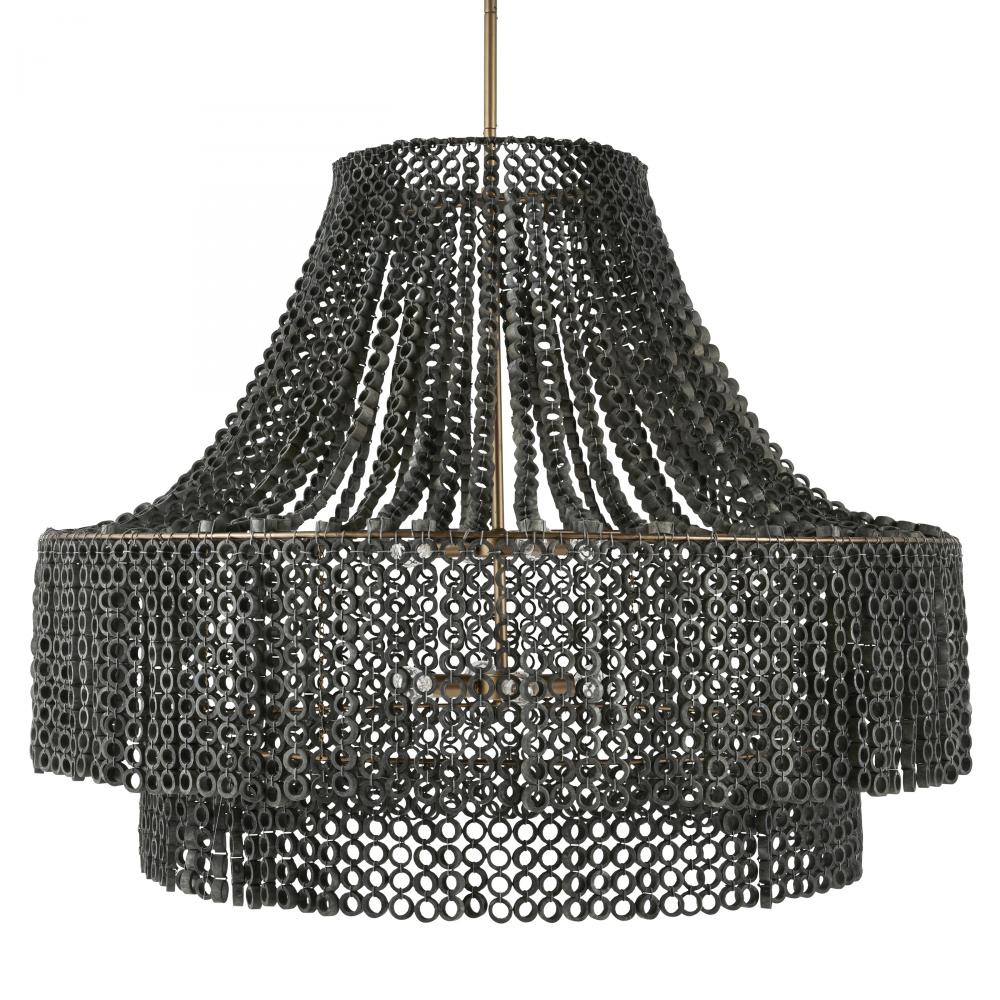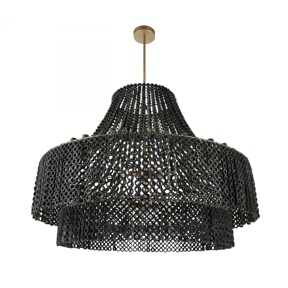 We updated the classic Hannie in a super-sized scale for extra impact, assuring it will be the ultimate statement piece. A beaded, dark gray wash Beechwood empire silhouette lays the foundation for creative detailing, including hand-carved circular beads layered to diffuse light throughout a space. This textural style suspends from an antique brass-plated iron pipe. Finish will vary.