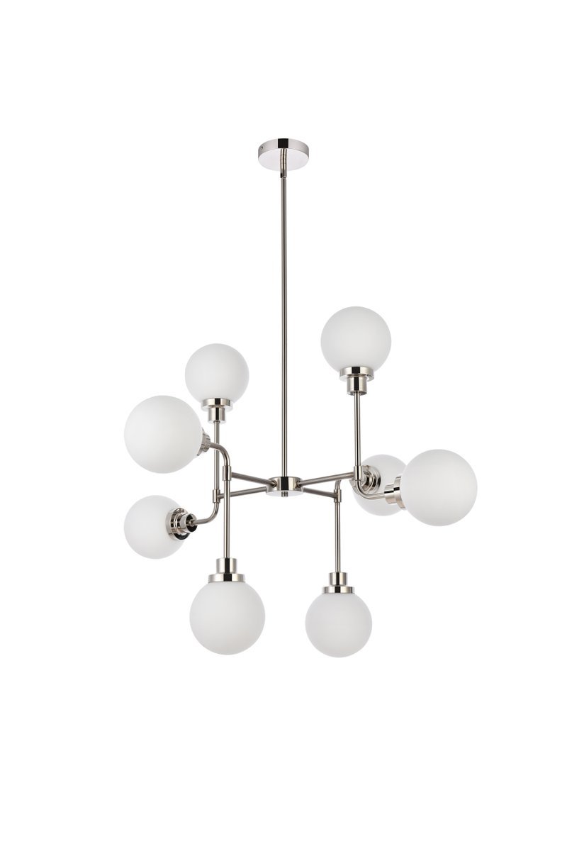Hanson 8 lights pendant in polished nickel with frosted shade is the perfect fixture for over a kitchen island, over a dining table, or use in any room to make a big statement. This pendant elevates the look of any space.