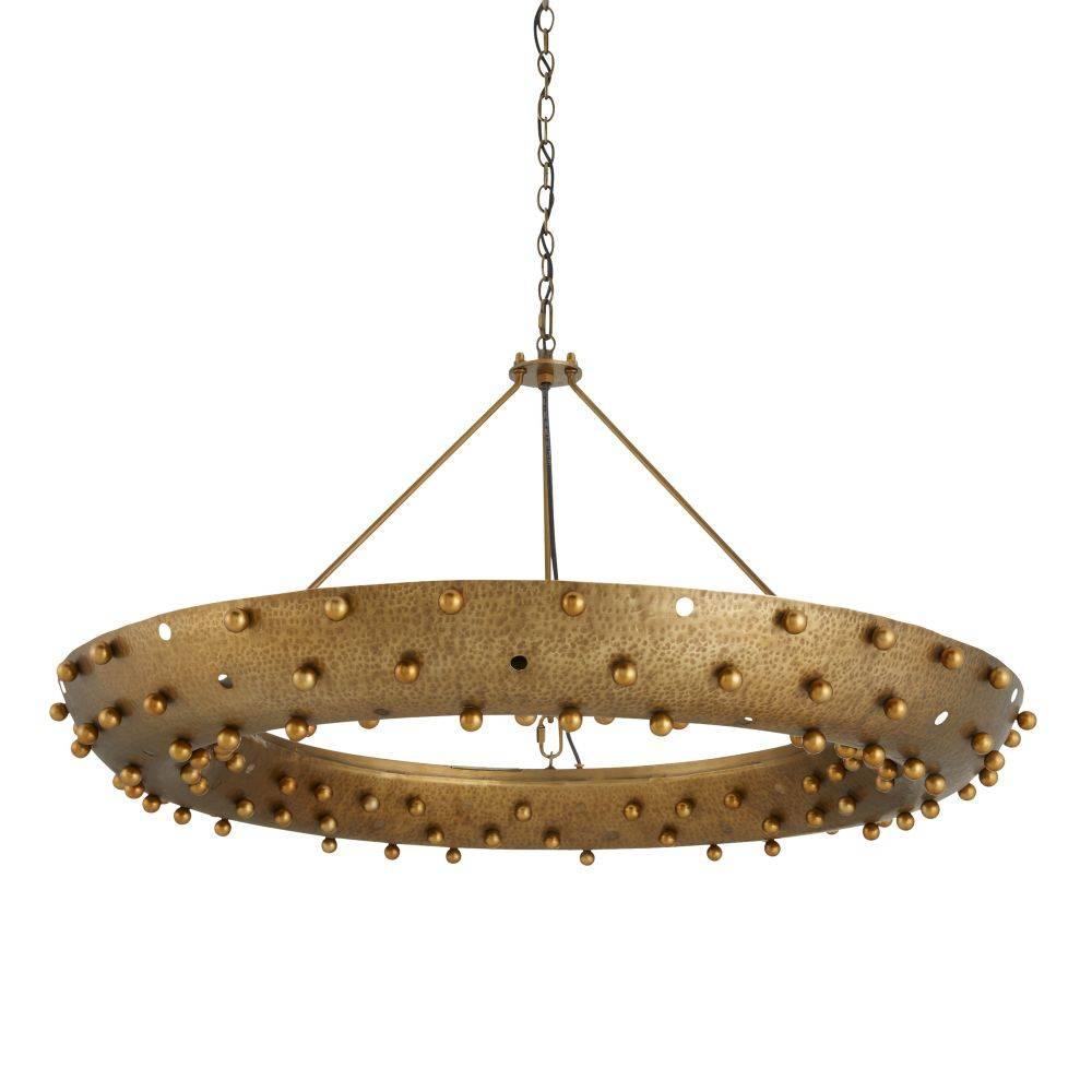 Our ring fixture of antique brass-plated iron featuring small spheres and cut outs to create a fascinating bleed of light around the room. Jewelry-inspired, its hammered surface is suspended from three brass-plated mounts. Damp-rated, although limited covered outdoor areas may affect finish. Finish will vary.
