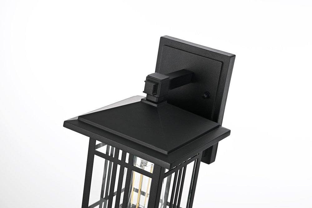 The square backplate provides a stable mount while complementing the lantern’s structured design.