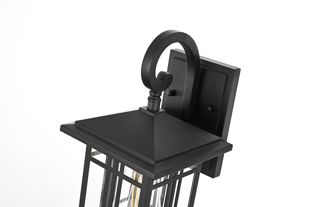 The square backplate provides a stable mount while complementing the lantern’s structured design.