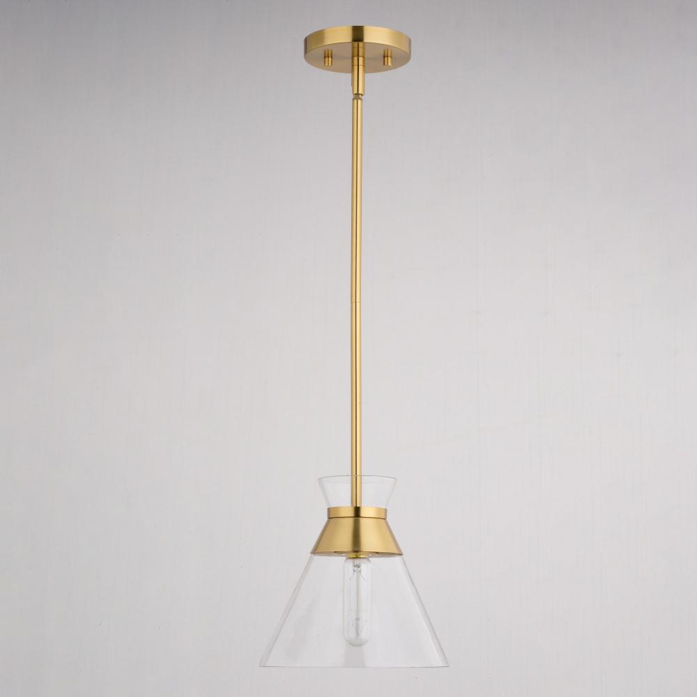 Indulge in mid-century modern charm with the Harper 1 Light Pendant. Its sleek, bowtie-inspired design and natural brass finish bring a touch of warmth and sophistication to your kitchen island or eat-in space. The clear glass shade beautifully showcases your choice of bulb, creating a captivating focal point.