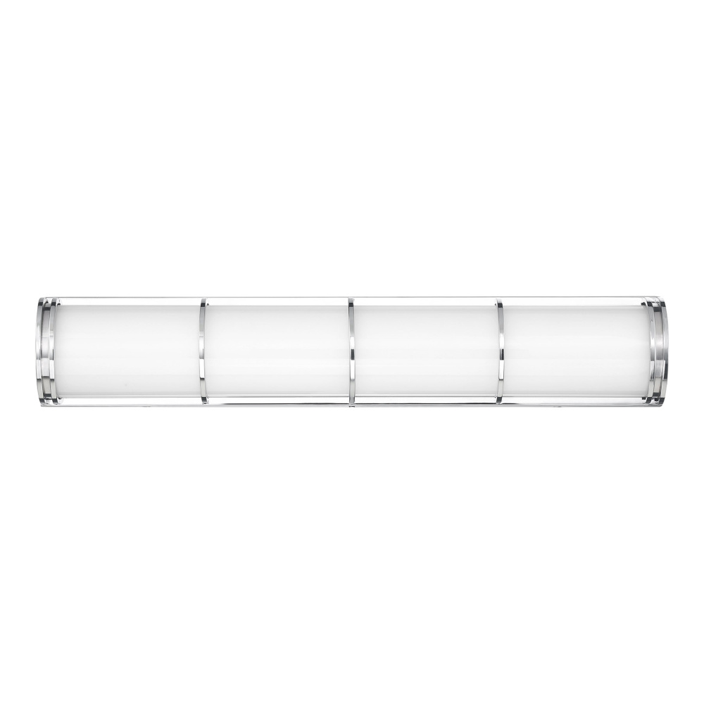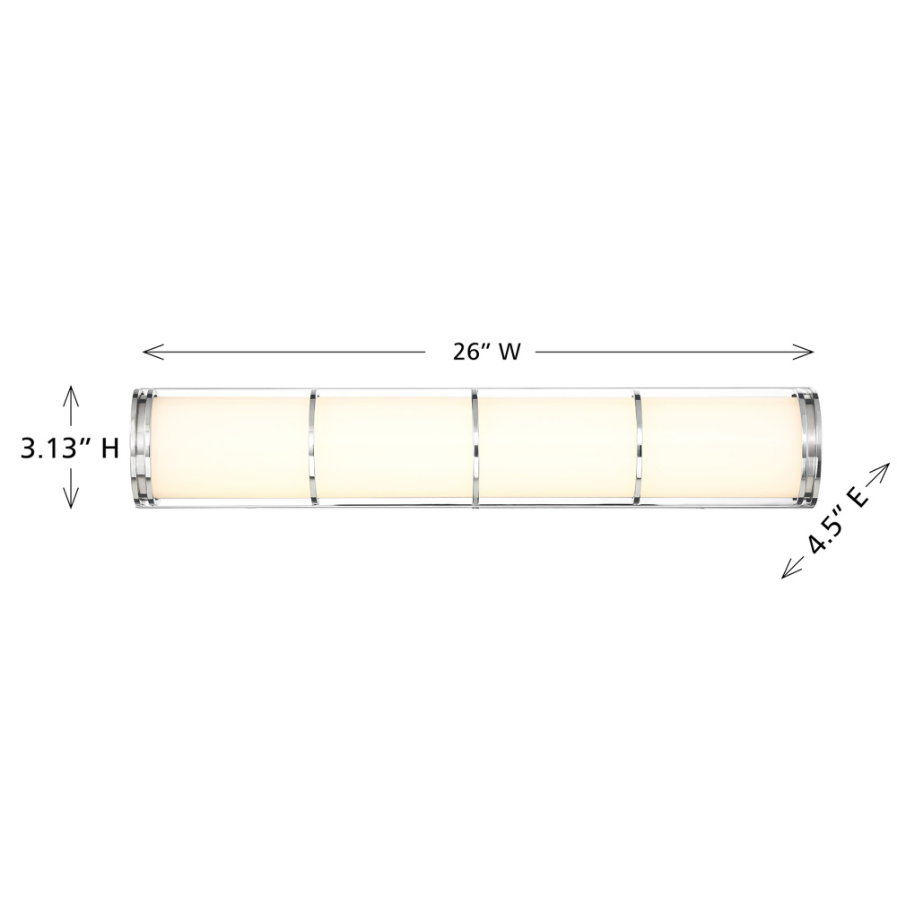 This Savoy House Harper LED wall light has a super sleek and chic look that makes it an ideal solution for bathroom vanities, hallways, foyers or any other space that needs a big dose of bright, contemporary illumination. The etched white glass shade is accentuated by slim detailing that is finished in Chrome, creating a perfect pairing. Harper is 3.13" in height, 26" in width and extends 4.5" from the wall. It is illuminated by integrated LED light, giving off 2550 lumens at a CRI of 90 and a color temperature of 3000K.
