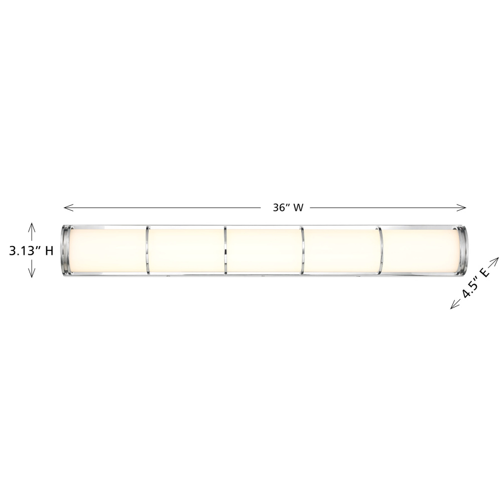 This Savoy House Harper LED wall light has a super sleek and chic look that makes it an ideal solution for bathroom vanities, hallways, foyers or any other space that needs a big dose of bright, contemporary illumination. The etched white glass shade is accentuated by slim detailing that is finished in Chrome, creating a perfect pairing. Harper is 3.13" in height, 36" in width and extends 4.5" from the wall. It is illuminated by integrated LED light, giving off 2700 lumens at a CRI of 90 and a color temperature of 3000K.