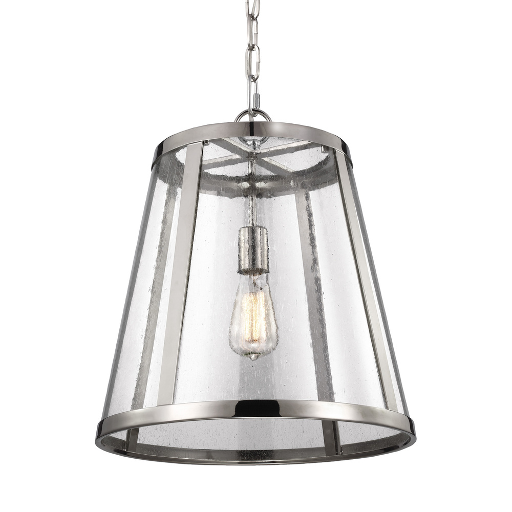 Combining the traditional profile of a tapered shade with on-trend Clear Seeded glass, the sleek frame and the square-linked chain give the Harrow pendant light collection an elevated, contemporary, transitional look. The wall sconce is delivered with two glass options, Clear Seeded and Opal Etched, for the customer's choice to customize. Burnished Brass, Oil Rubbed Bronze, and Polished Nickel finishes are available to create completely different looks.