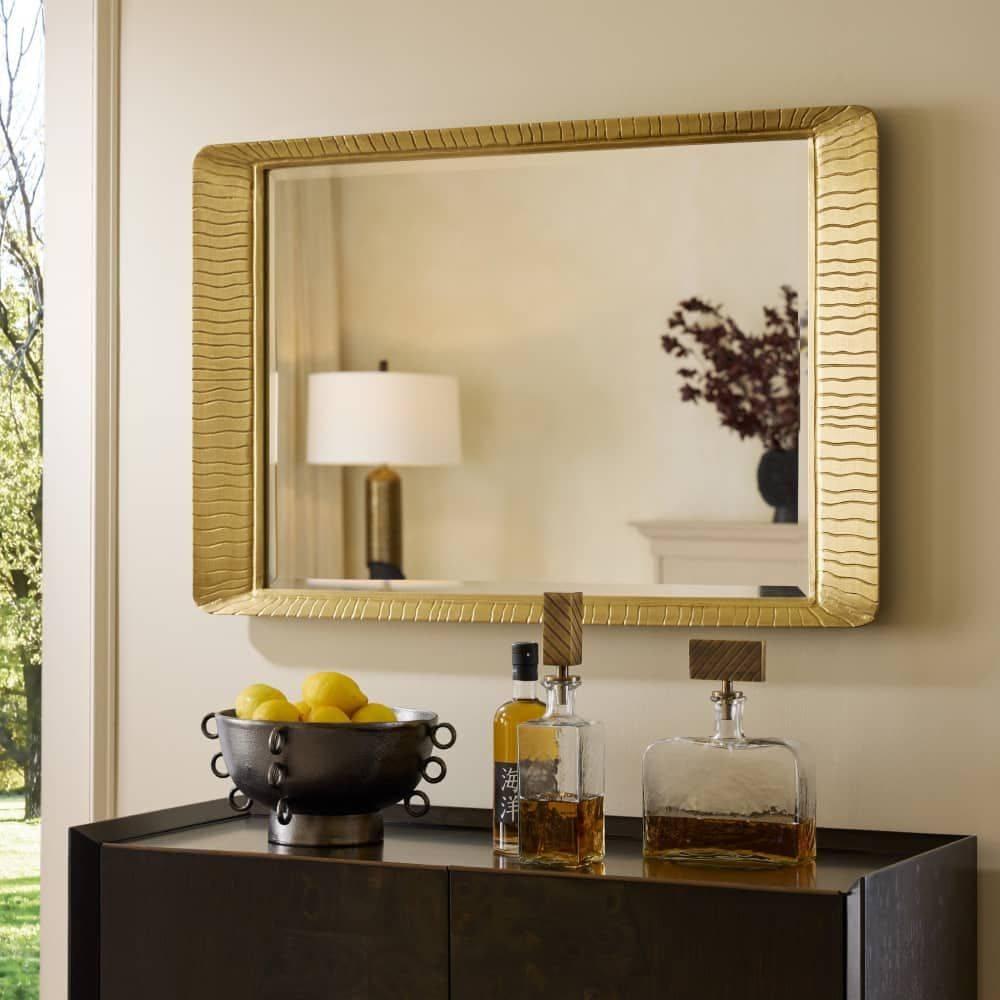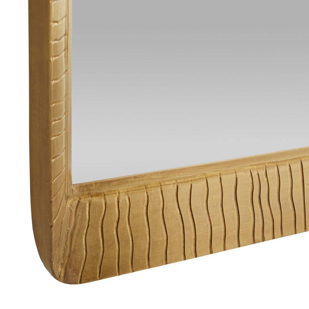 A rectangular beveled glass mirror is offset by an antique brass frame cast in a sunburst finish. The repeating waved pattern adds movement to its extroverted form. Designed to be hung both vertically and horizontally, it is secured at the back with a cleat attachment.