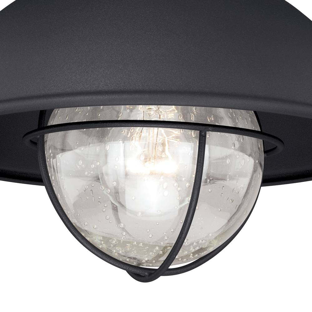The Harwich flush mount barn light features a textured black finish with clear seeded glass shade. Its iconic nautical-style is at home in a cottage, country or coastal setting and is exactly what is needed to add style and distinction to any entryway, porch or patio area.