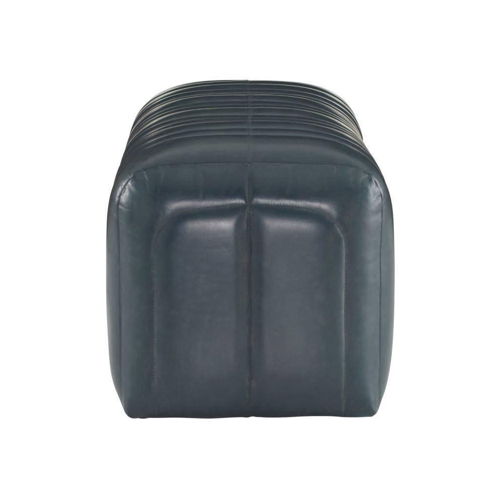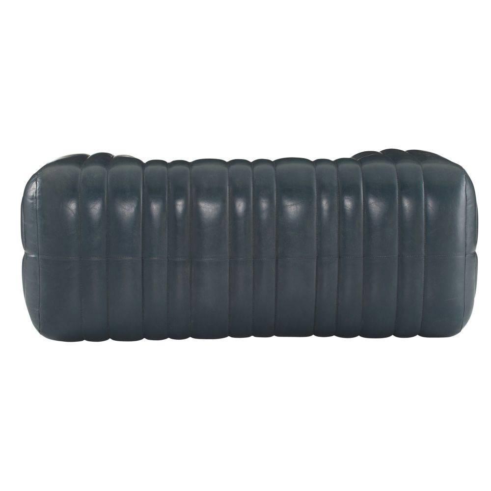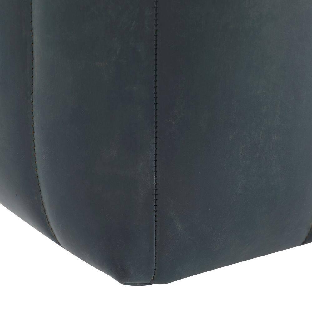 Built with generous proportions and varied channeling, a gymnastics pommel horse influenced the rounded form of our distressed storm leather bench. Its wide sides and graphic opening give it a visual appeal from every angle, while the robust scale gives a grounded feeling to any seating area. Leather will vary.