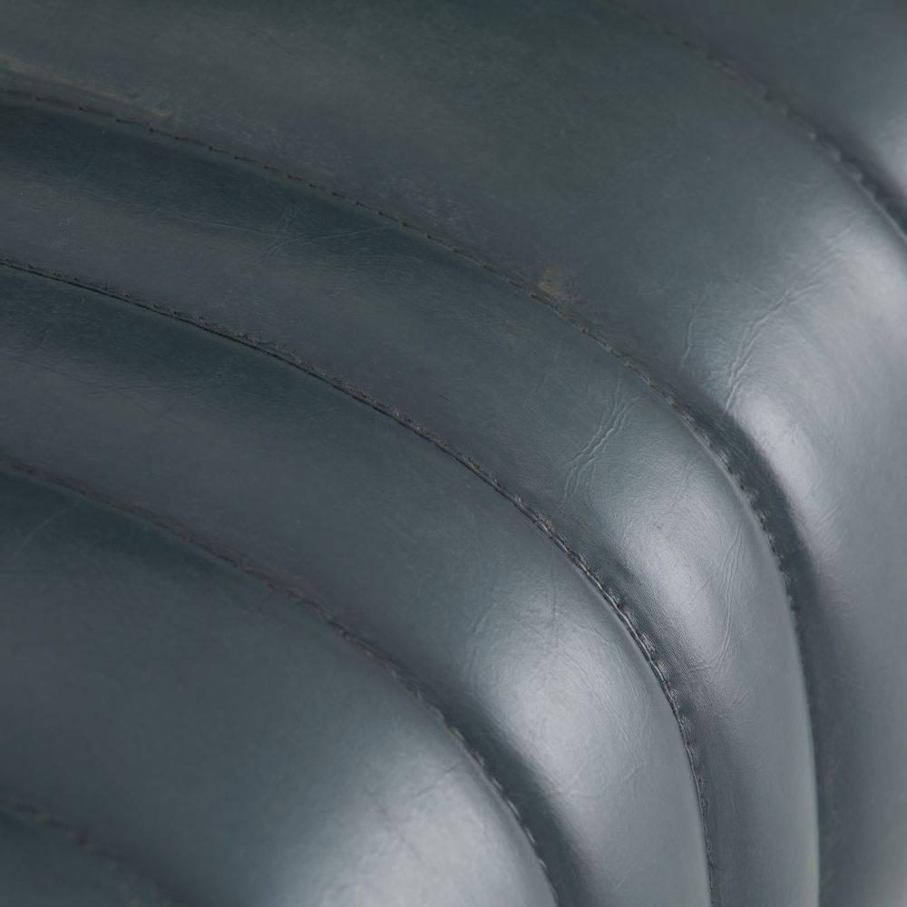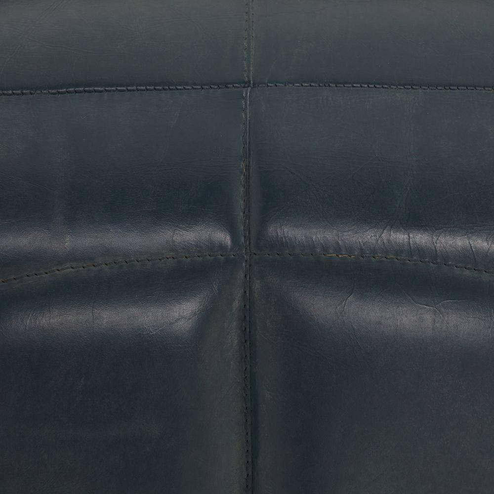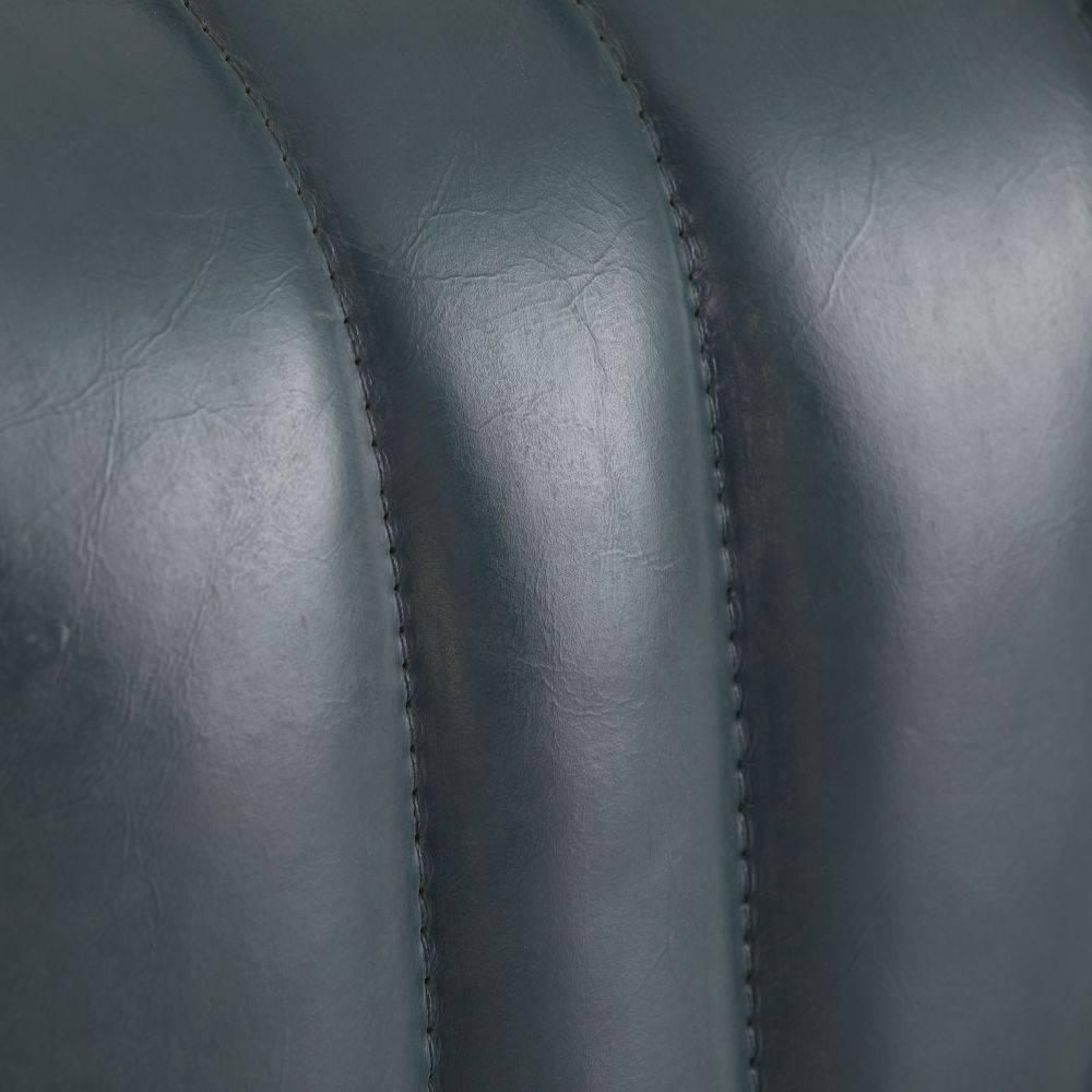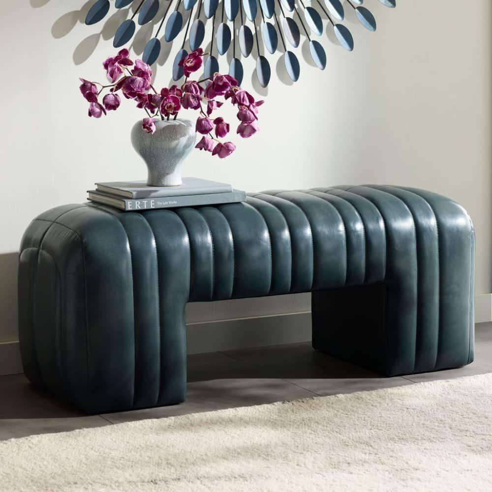 Built with generous proportions and varied channeling, a gymnastics pommel horse influenced the rounded form of our distressed storm leather bench. Its wide sides and graphic opening give it a visual appeal from every angle, while the robust scale gives a grounded feeling to any seating area. Leather will vary.