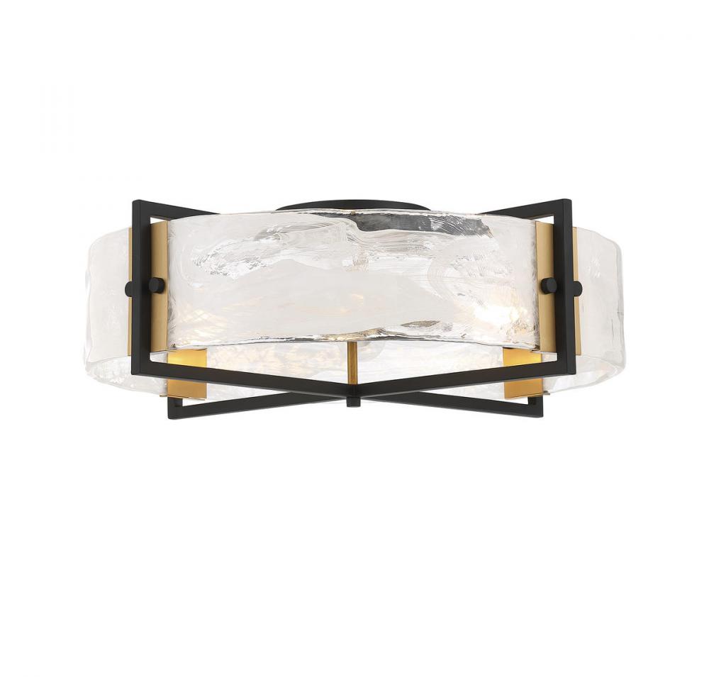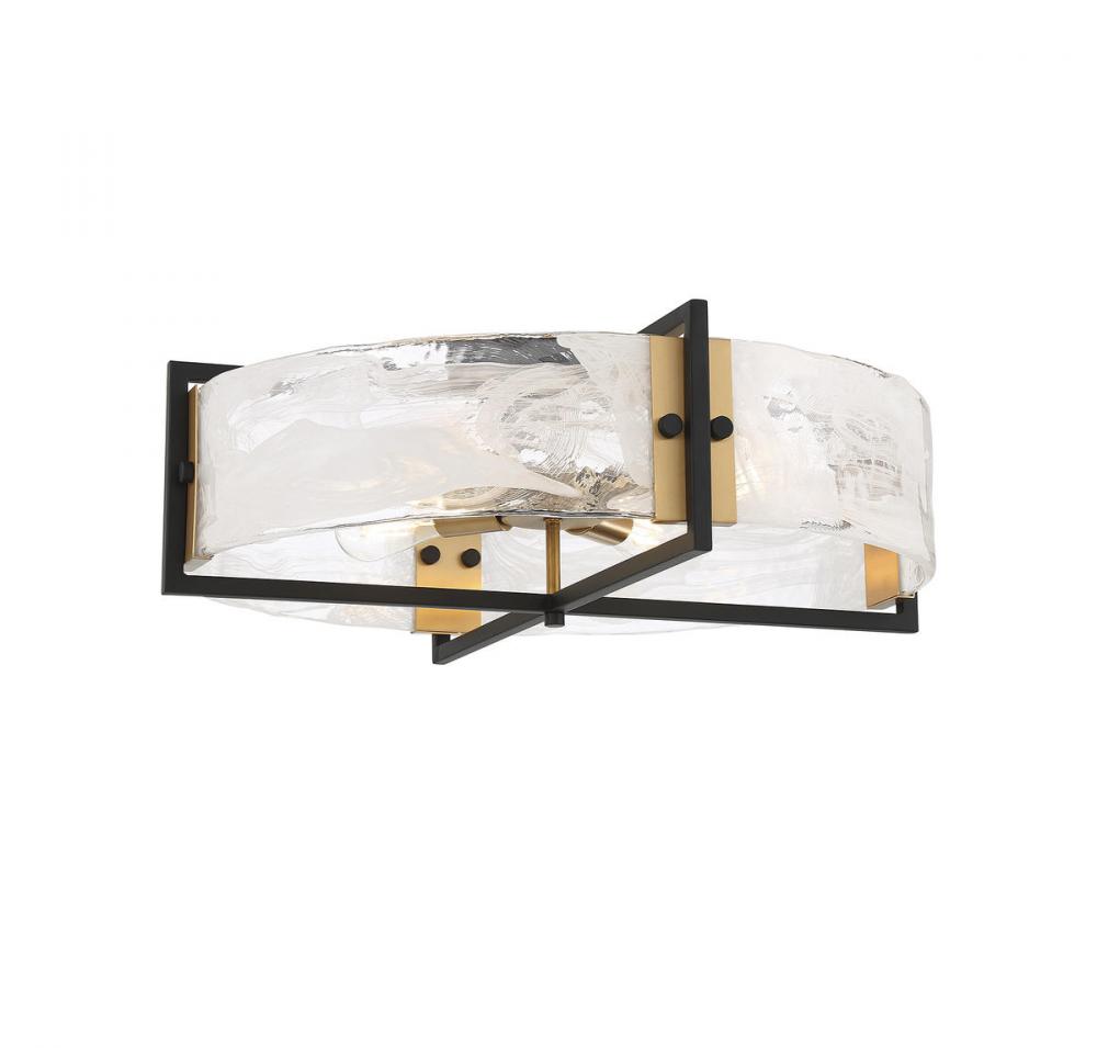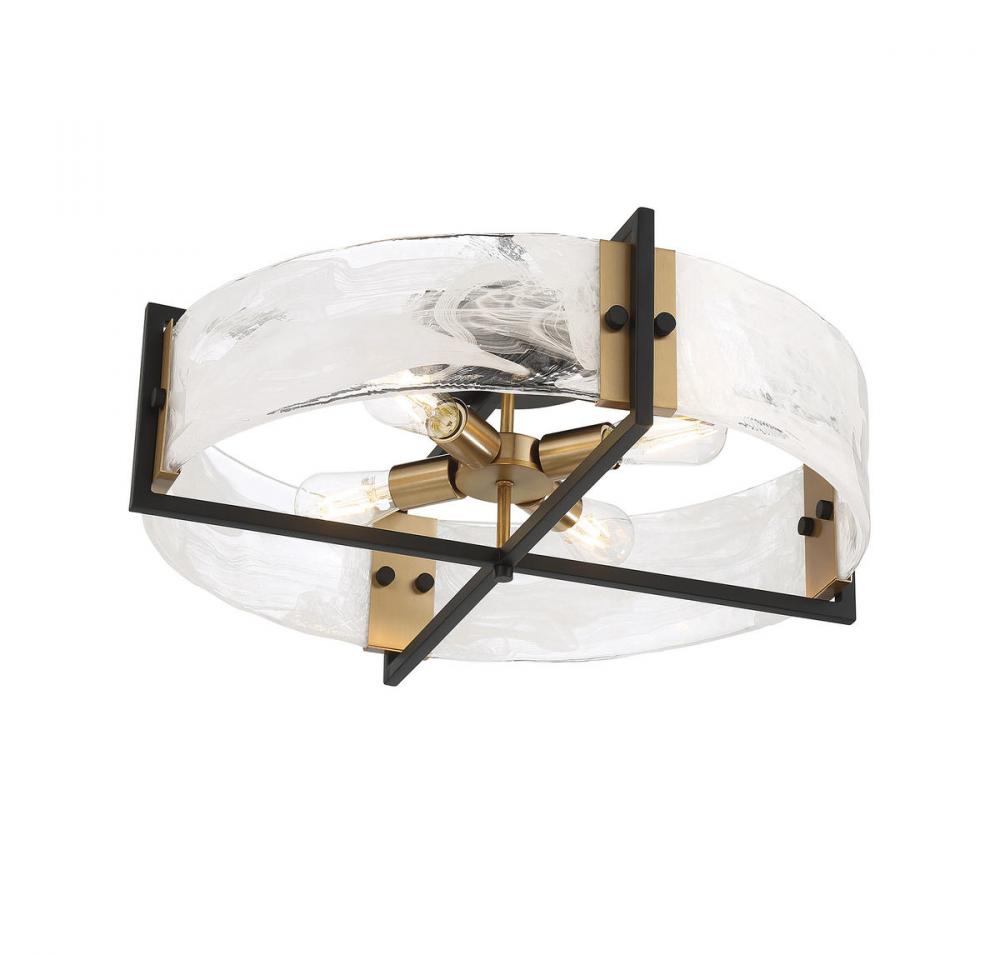 Swirling, mesmerizing strie piastra glass surrounds the lights within the Savoy House Hayward 4-light ceiling light. The matte black frame showcases warm brass accents for another dimension of style. Hayward is 8" in height and 24" in width. It uses four standard size bulbs of up to 60 watts per bulb.