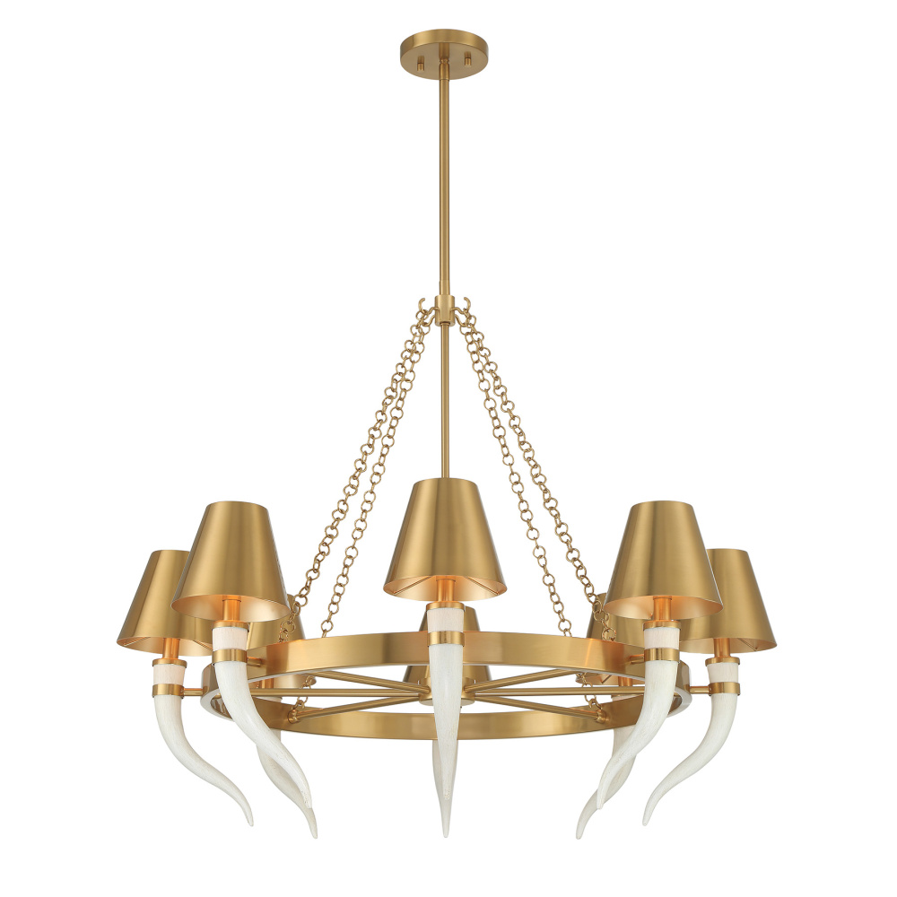 Award-winning interior designer Dann Foley's creative vision shines in the Savoy House Hearne 8-light chandelier. A constellation of curved horn forms radiates from the center, each topped with solid metal shades that concentrate and cast the light with theatrical impact. The Warm Brass finish emphasizes the sculptural structure beautifully. Hearne measures 36" wide with an adjustable height of 30.5" to 84.5". Uses eight candelabra size bulbs of up to 60 watts per bulb (not included). Includes four 12" downrods and one 6" downrod.