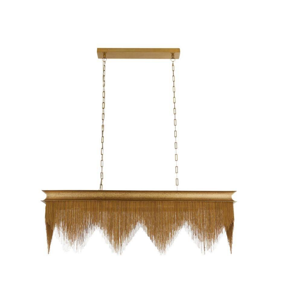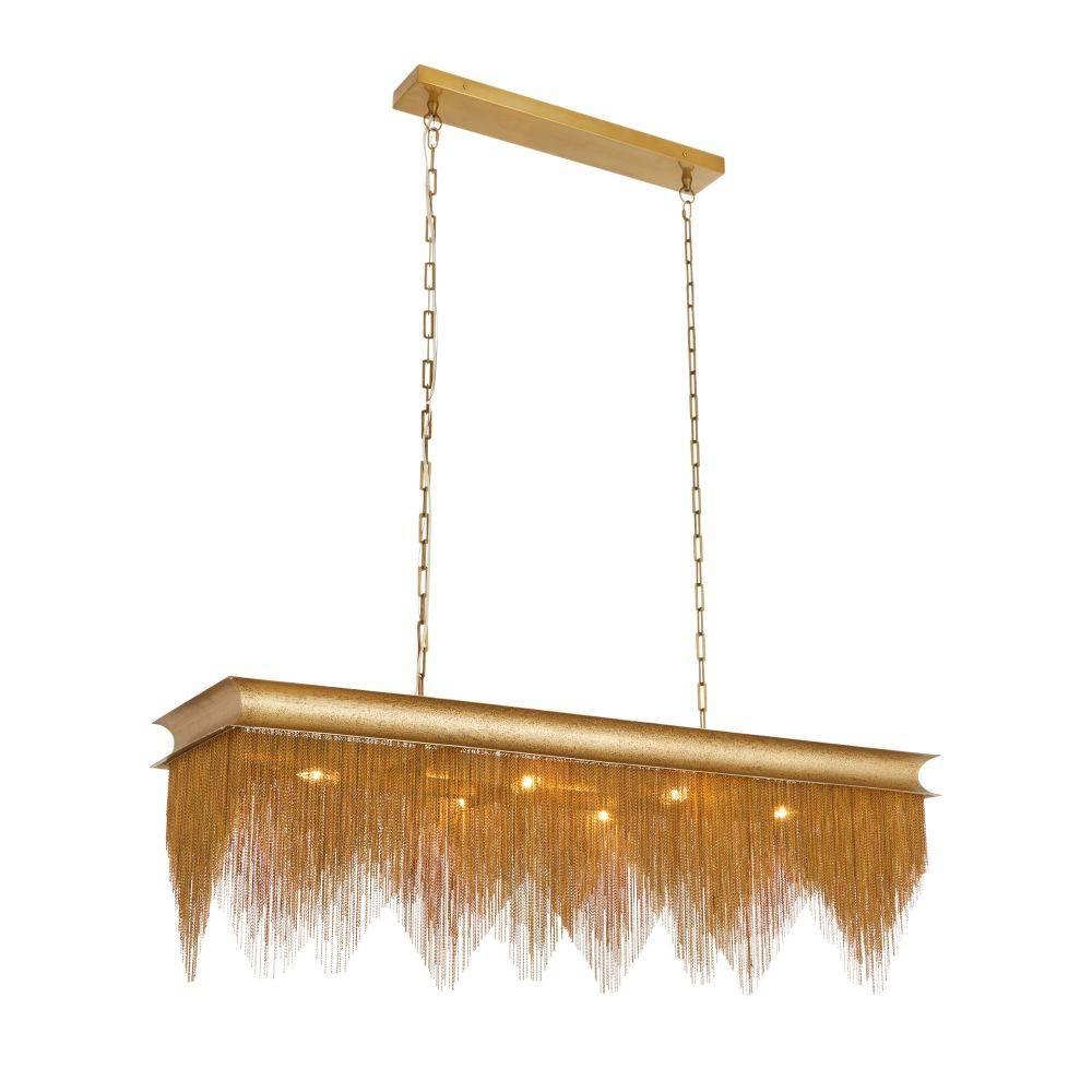 The shapes and textures of Southwest fine jewelry inform a dazzling fixture of vintage brass-plated iron. Zig-zag antique brass chains reminiscent of a lizard's spikes deliver subtle movement and a reflective glimmer. The delicately textured vintage brass iron frame is suspended from the ceiling by dual vintage brass chains. Damp-rated, although limited covered outdoor areas may affect finish.