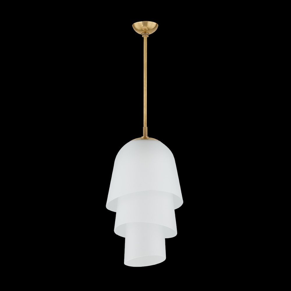 Recalling the shape of a bluebell, the Hela pendant features a three-tiered bloom crafted from etched clear glass. The bias cut on the glass ends enhances the overall fluidity of the silhouette, creating a sense of movement from every angle. When illuminated, Hela emits a warm diffusion of light that is complemented by a Vintage Brass rod.