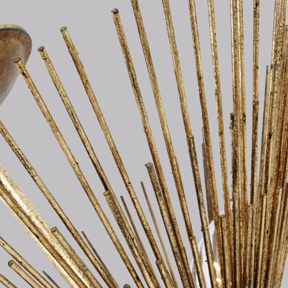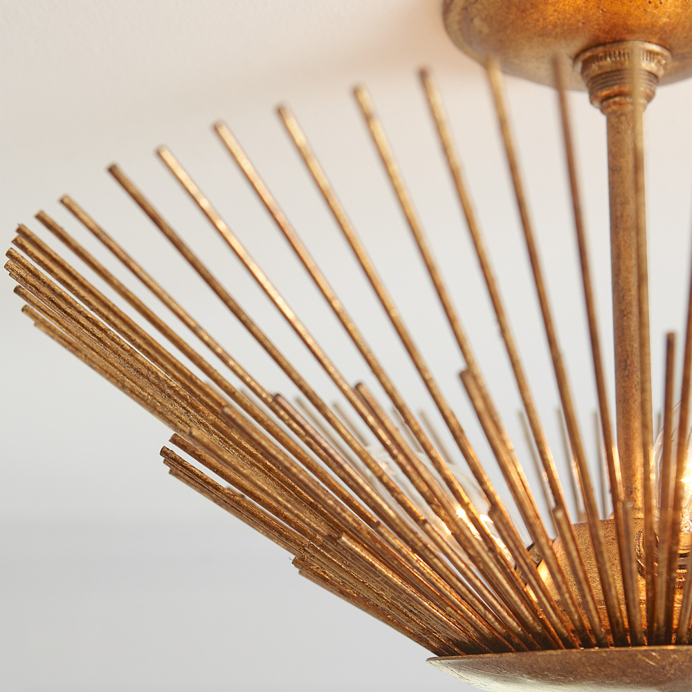 Named after the Greek God of the Sun, the Alexa Hampton Helios three light semi flush in Antique Gild is made with hand applied gold leaf and then hand distressed. This Mid-Century Modern fixture takes the shape of its name, with up-flowing stems resting elegantly on a round metal canopy with each metal rod hand cut and hand welded straw-like brass layers forming the shade of this textural fixture. The Helios flush mount features a dynamically cut, sun-like form and gilded iron finish. This stunning piece is an eruption of light and brings a stylish presence to any aspect of your space. The assortment includes a four-light wide pendant, six-light small pendant, eight-light tall pendant, three-light semi-flush and one-light pocket sconce. Alexa Hampton is an industry force who honors tradition and commits to the future, providing smart, stylish, design-rich solutions for every aspect of the home.