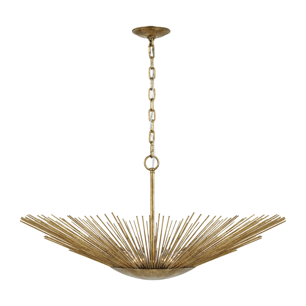 Named after the Greek God of the Sun, the Alexa Hampton Helios four light indoor pendant in Antique Gild is made with hand applied gold leaf and then hand distressed. This Mid-Century Modern fixture takes the shape of its name, with up-flowing stems resting elegantly on a round metal canopy with each metal rod hand cut and hand welded straw-like brass layers forming the shade of this textural fixture. The Helios flush mount features a dynamically cut, sun-like form and gilded iron finish. This stunning piece is an eruption of light and brings a stylish presence to any aspect of your space. The assortment includes a four-light wide pendant, six-light small pendant, eight-light tall pendant, three-light semi-flush and one-light pocket sconce. Alexa Hampton is an industry force who honors tradition and commits to the future, providing smart, stylish, design-rich solutions for every aspect of the home.