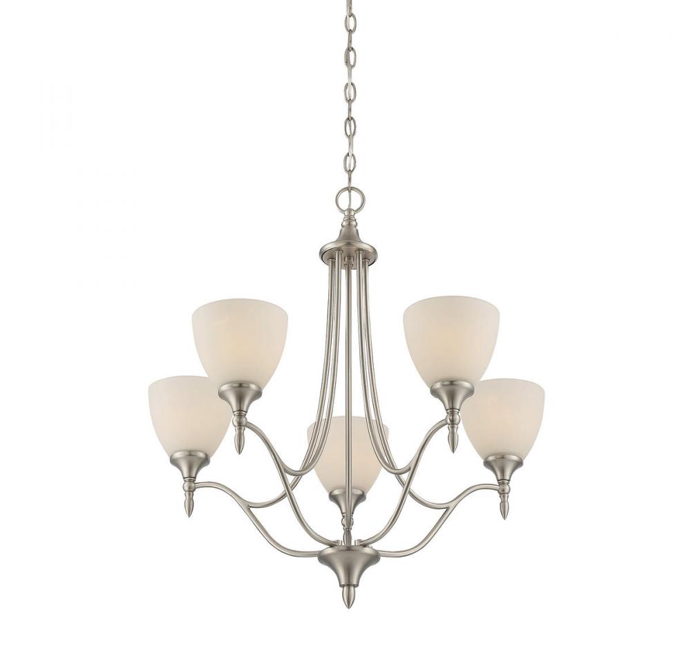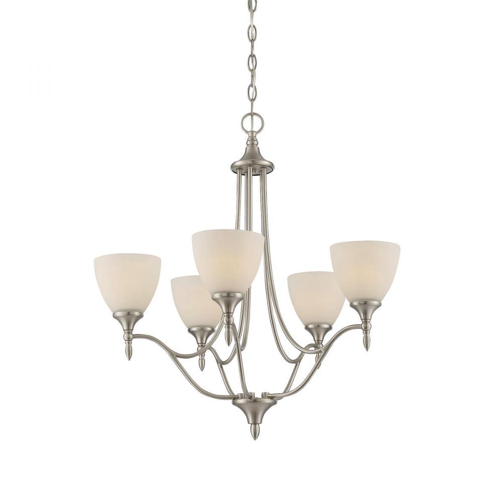 Great lighting, like the Savoy House Herndon 5-light chandelier, is a key piece of home design! Finished in timeless satin nickel, its streamlined, finely crafted details create a clean, classic design that looks terrific. The style is familiar and pleasant, which sets a serene and relaxed mood. Graceful arched light arms have white frosted glass shades and five 60W standard size bulbs provide soft, flattering light to ensure you and your guests are comfortable. This chandelier is 26" wide and 27.5" high, creating a stylish fixture with casual elegance you’ll enjoy for years to come.