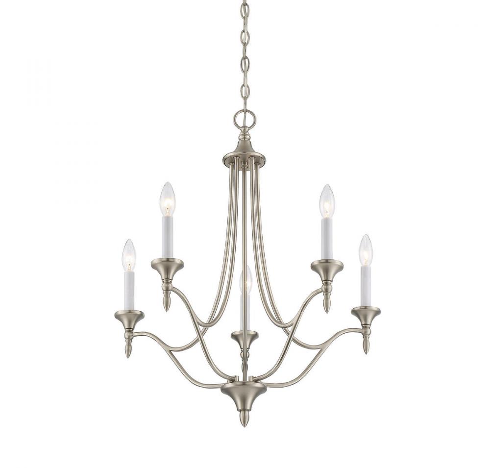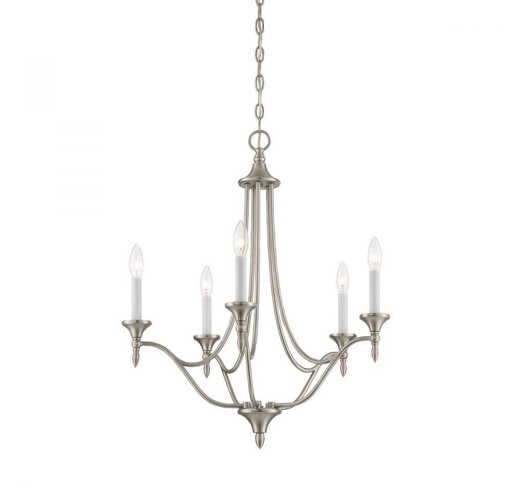 Great lighting, like the Savoy House Herndon 5-light chandelier, is a key piece of home design! Finished in timeless satin nickel, its streamlined, finely crafted details create a clean, classic design that looks terrific. The style is familiar and pleasant, which sets a serene and relaxed mood. Graceful arched light arms hold five 60W candelabra size bulbs that provide soft, flattering light to ensure you and your guests are comfortable. This chandelier is 21" wide and 27.5" high, creating a stylish fixture with casual elegance you’ll enjoy for years to come.