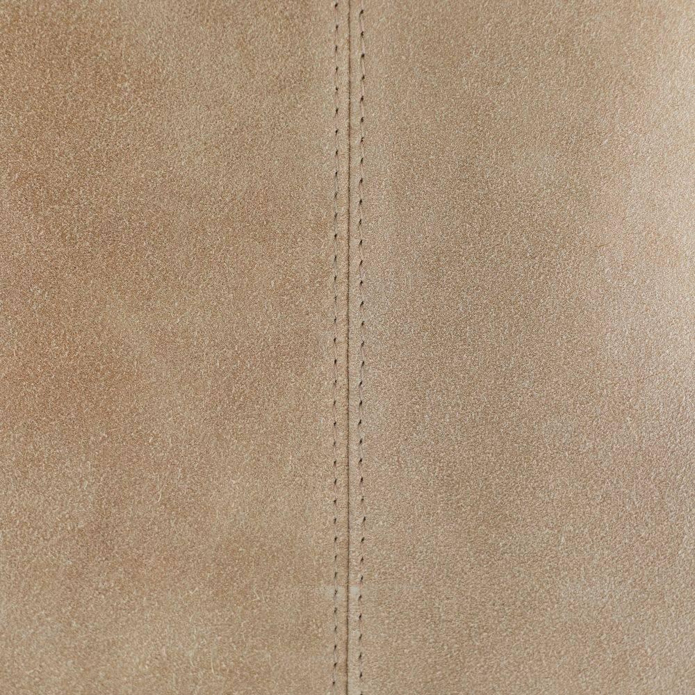 A comfortable dining or living room option, the Hershel delivers a modern mix of materials. The taupe suede seat delivers a slim profile with a soft curved back and demi arms that cradle the body. Blonde beech wood legs are lightly textured and finished with blackened bronze iron ferrules. Suede will vary.