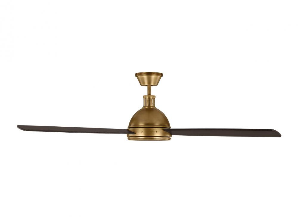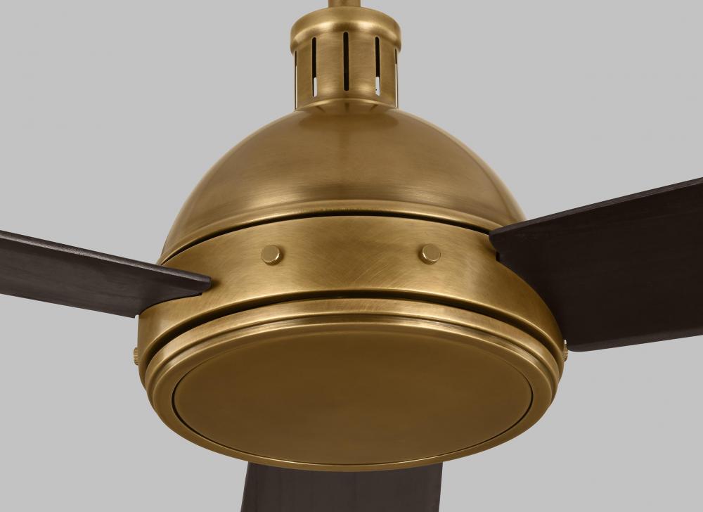 The Thomas O'Brien Hicks 60 in Hand-Rubbed Antique Brass features a 178.0 X 22.0 6 speed motor with a Thirteen degree blade pitch. Inspired by Thomas O’Brien’s Hicks vintage pendants, a new introduction of ceiling fans are flawlessly implemented with industrial charm. The beautifully shaped integrated LED shallow dome, while the signature metal band with rivet details becomes the spinning blade element. Available in two finishes.