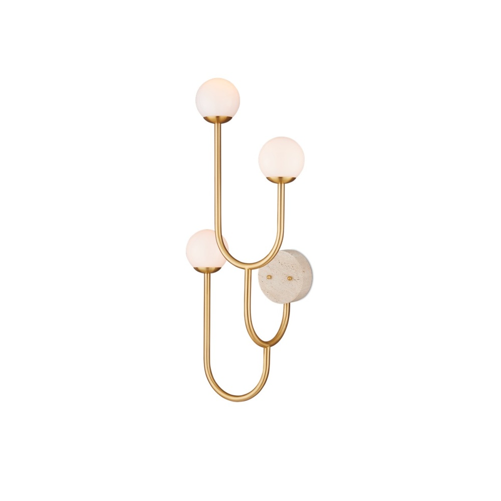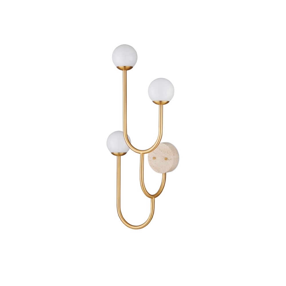 A nostalgic design with milk glass globes that have been popular since Americana was new, the Highsmith Wall Sconce, Left, has an undulant personality. The metal stems that arc up to culminate in three heights on the gold sconce are in a brass finish, as are the brads that fasten the travertine wall-plate in place. The mix of these materials is a refined design detail on this sconce that has a right-facing partner for flanking fireplaces or beds.