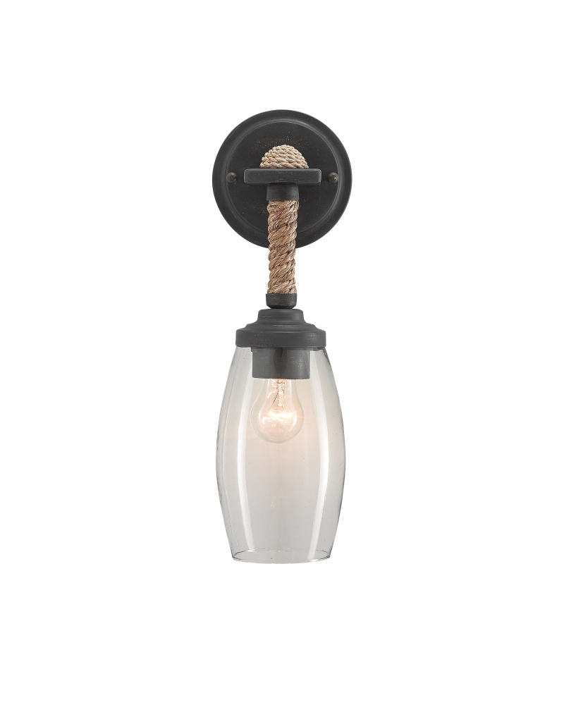 The perfect combination of natural and industrial materials, the Hightider Wall Sconce has a recycled glass shade and a wrought iron frame in a French black finish. The Abaca rope that is wrapped around the neck of the nautical sconce brings it a hint of texture.