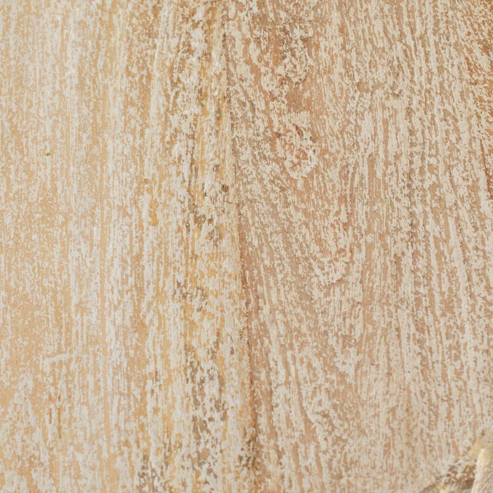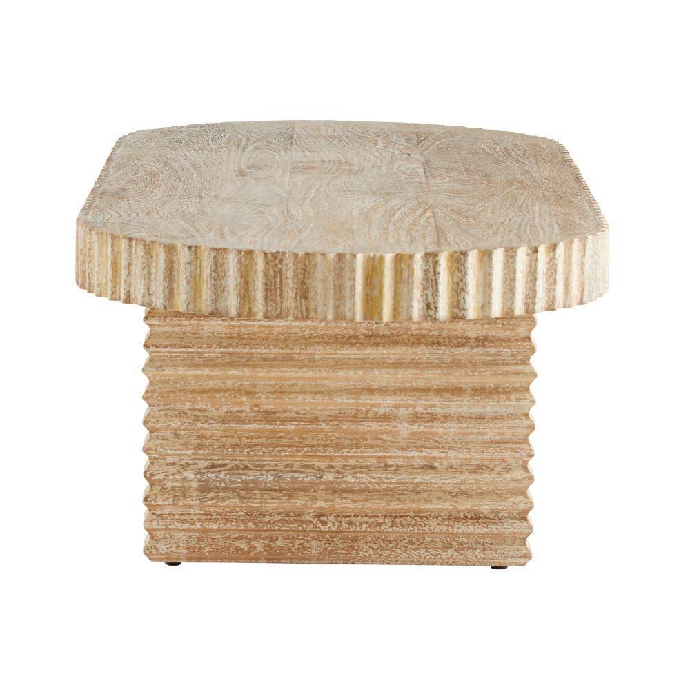 An overscaled slab of limed-wash mango wood is heavily carved and sandblasted to bring out the material's natural texture. Finished with a rhythmic grooved texture on the sides and legs, the pure form of this transitional style allows it to work within any coastal or contemporary setting. A multi-purpose accent piece, the Hilbeck can also serve as a bench. Finish will vary.