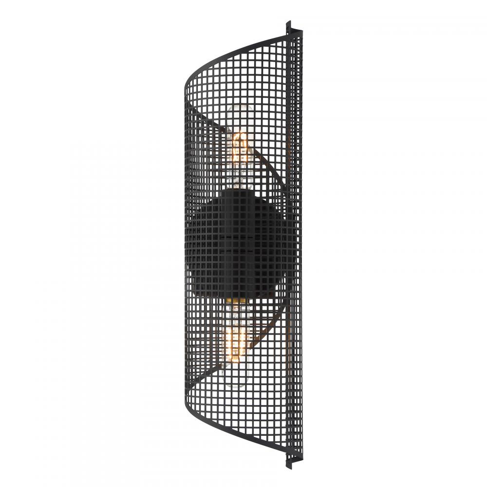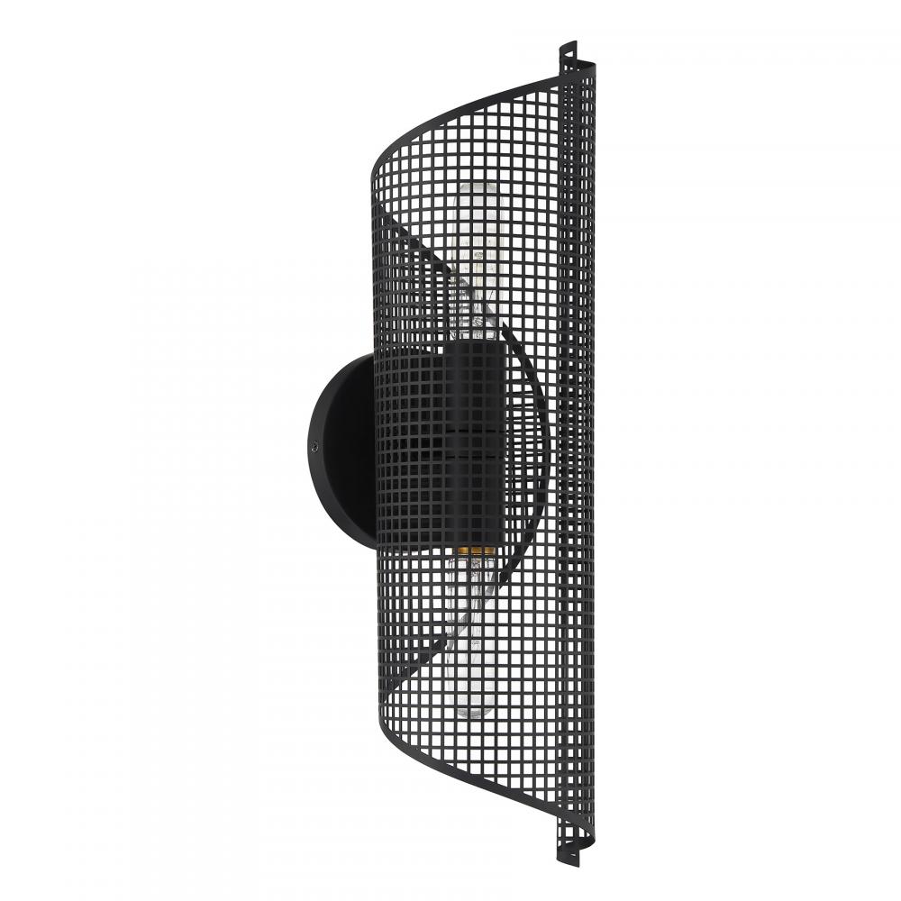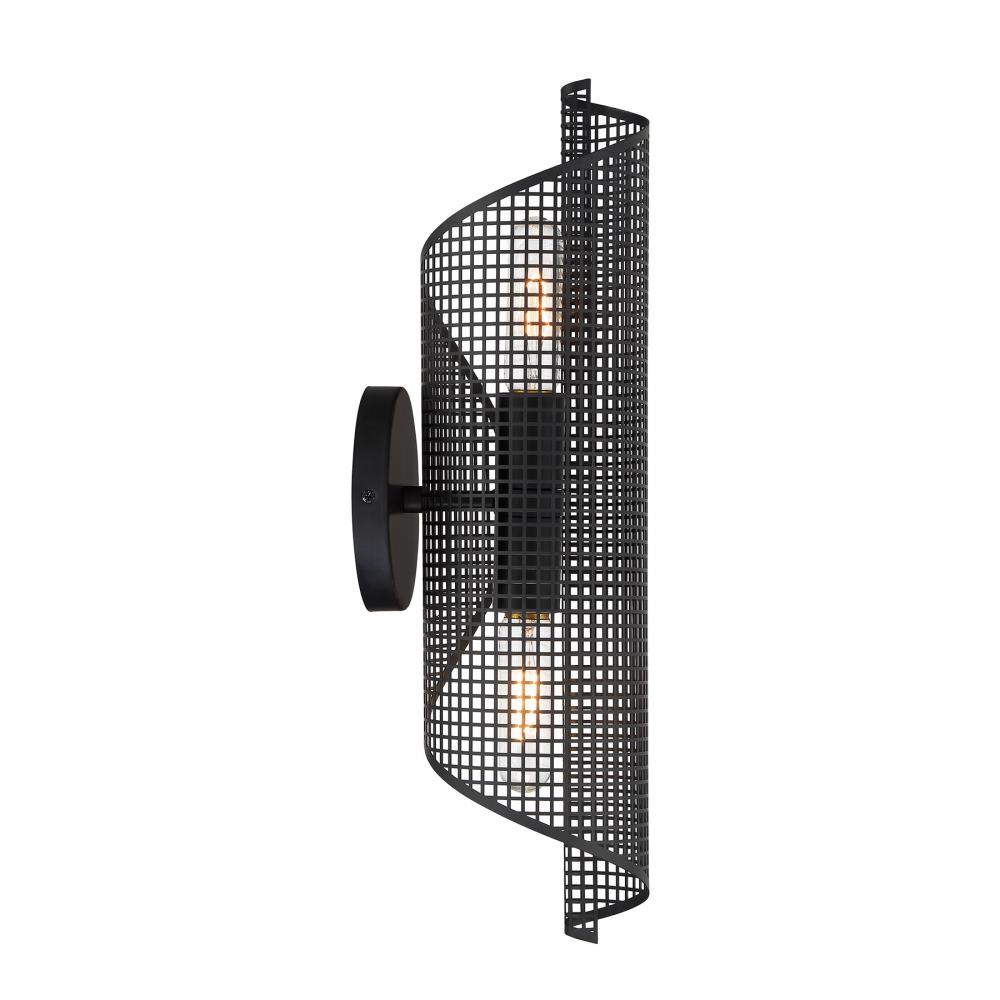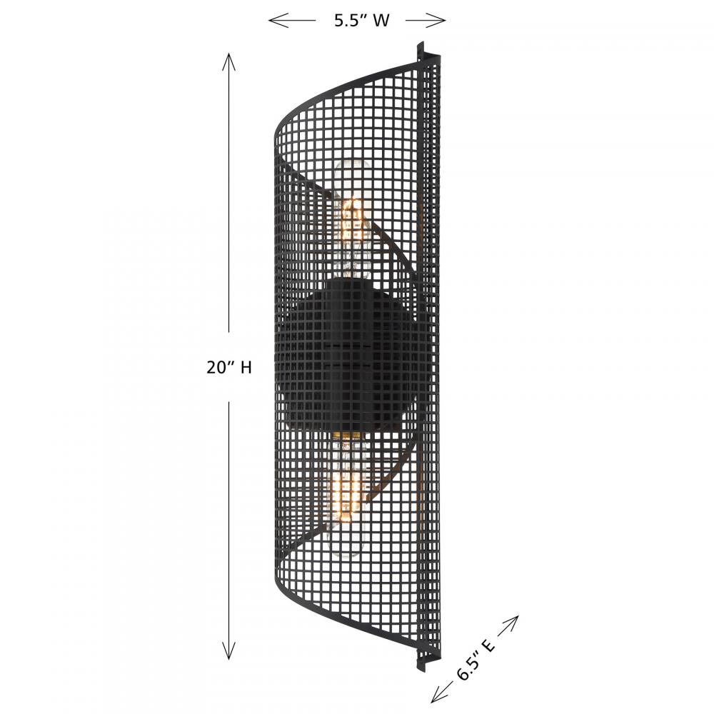 The Savoy House Hillbourne 2-light sconce is a ribbon of intriguing urban loft style. Its perforated metal shade, finished in Matte Black, appears to swirl and twirl on the wall. Use it alone or in groupings! Hillbourne is 20" in height, 5.5" in width and extends 6.5" from the wall. Uses two standard size bulbs of up to 60 watts per bulb. Bulbs not included. This sconce is damp area rated.