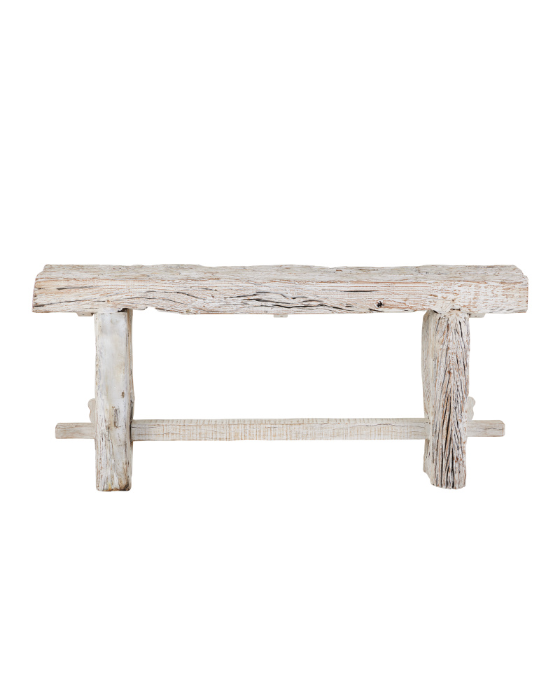 The Holland Console Table is a sustainable piece given it is made from reclaimed wood that is remarkably aged, which brings its surfaces tremendous personality, as does the trestle design with its mortise and tenon joinery. Because the whitewashed table is made from such raw wood, no two will be exactly alike. This piece is meant to be placed indoors only.