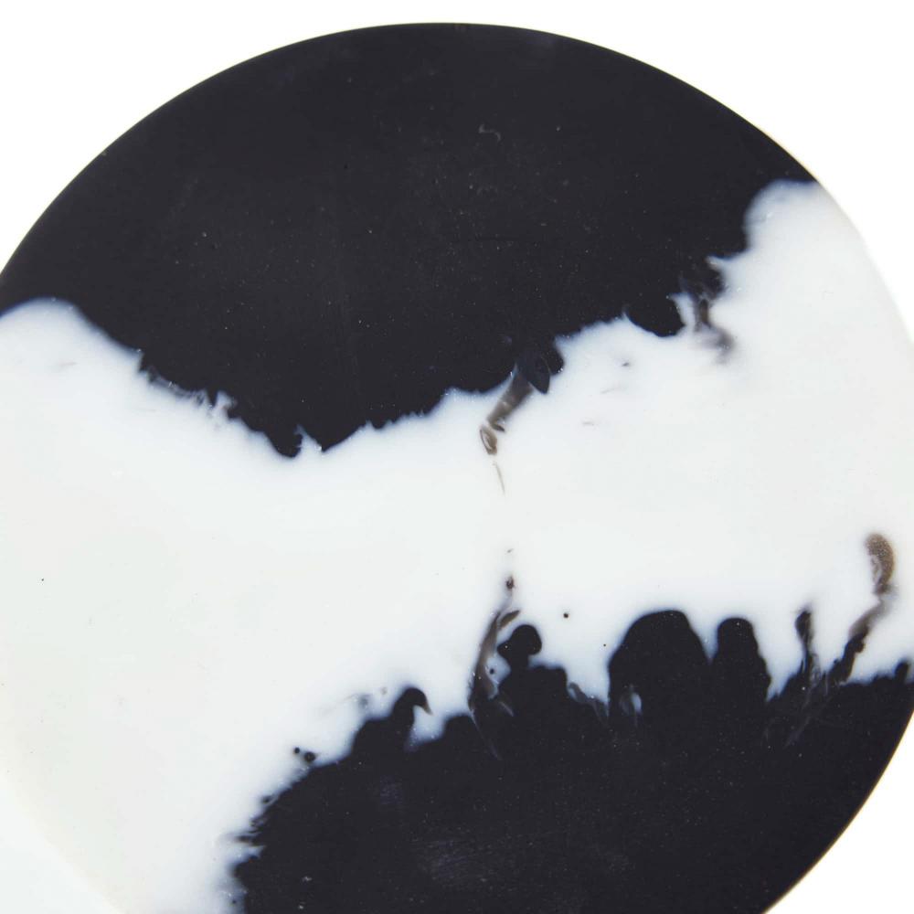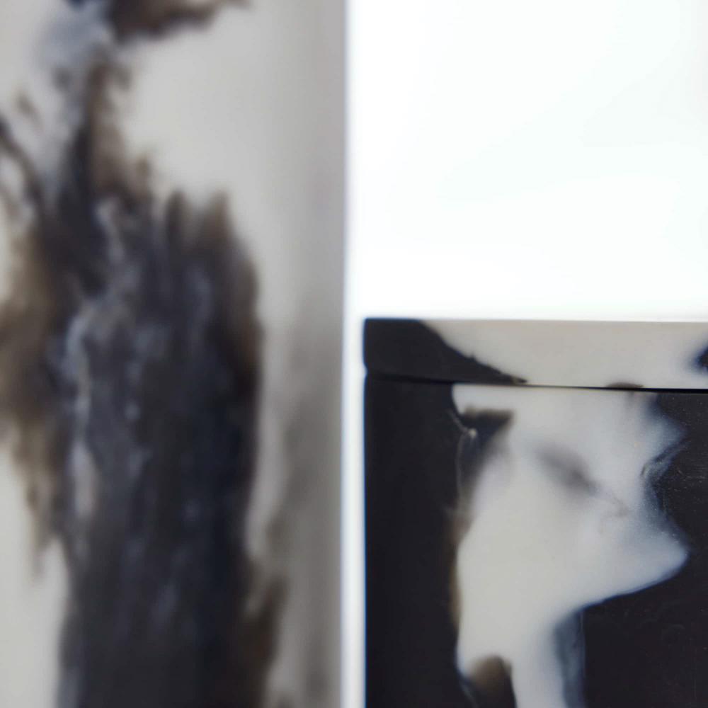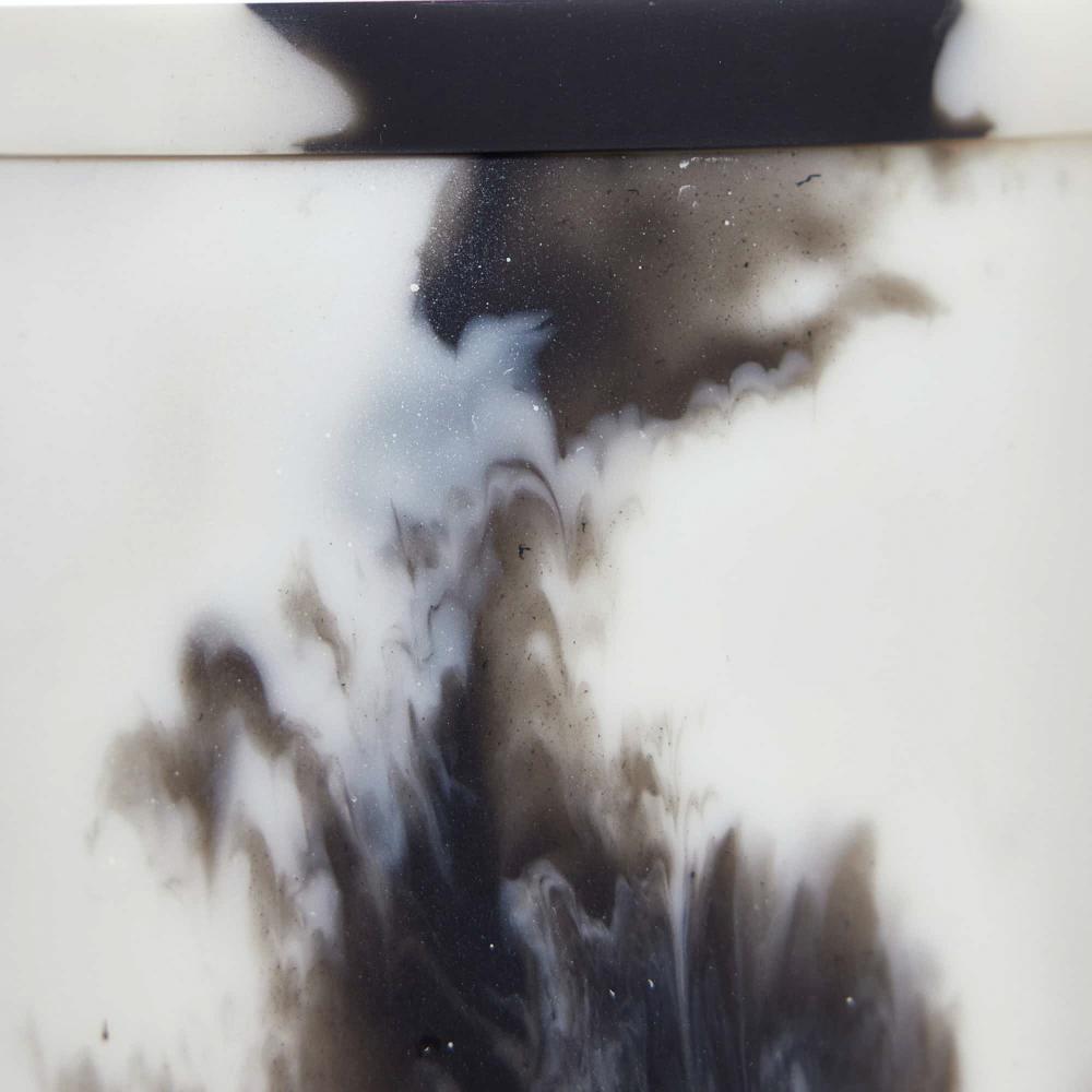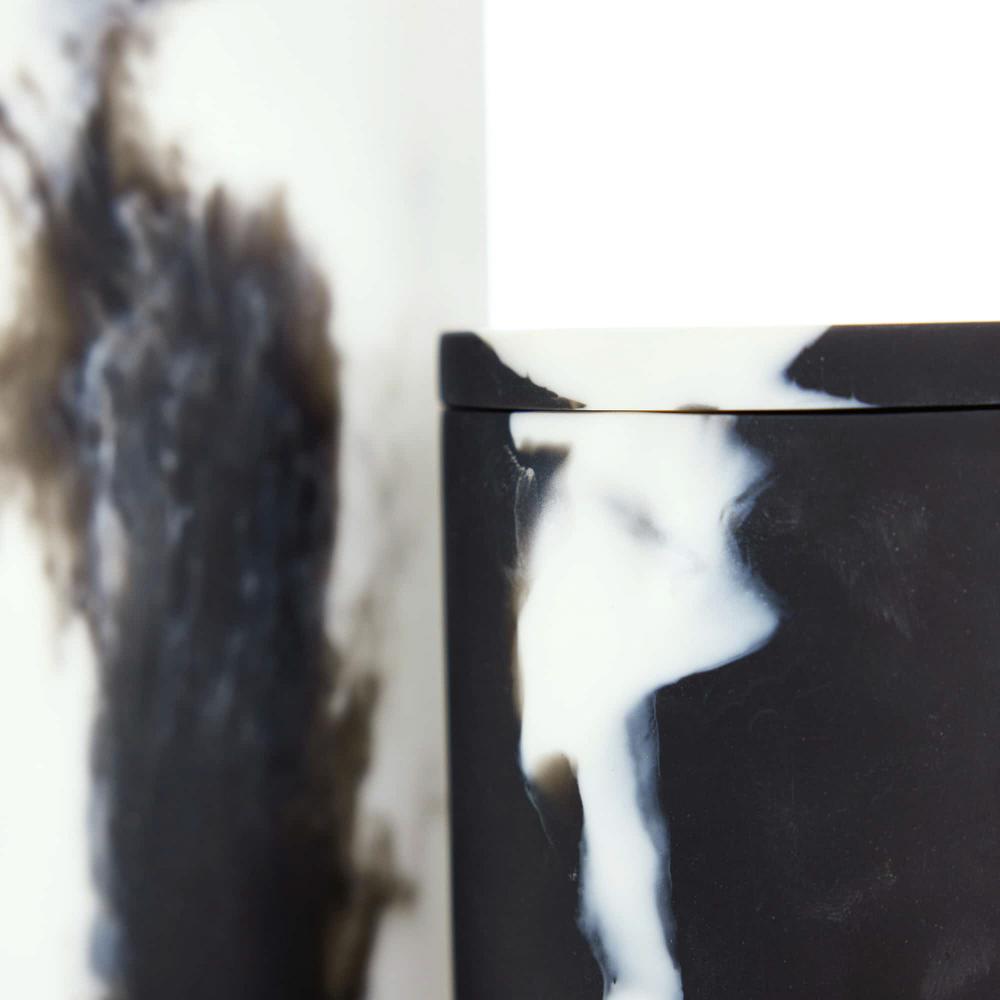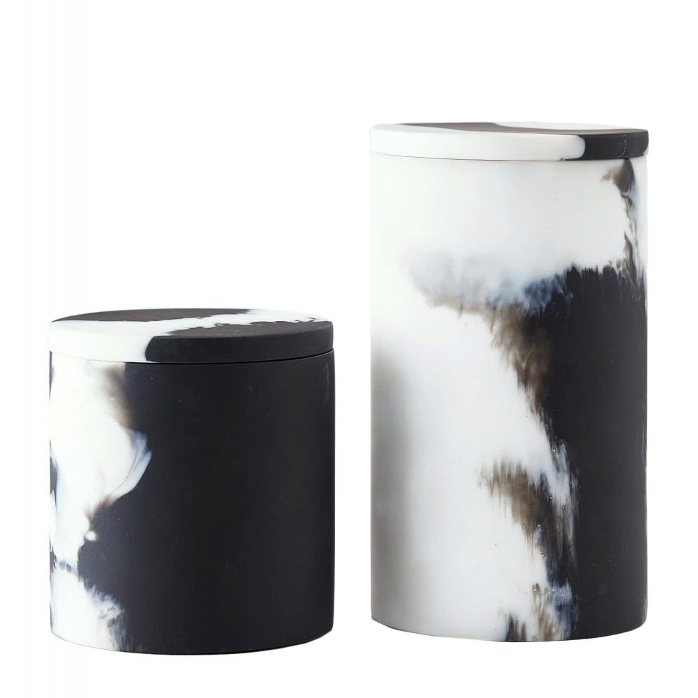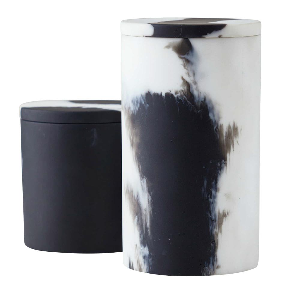 THE HOLLIE CONTAINERS EXPLORE THE CONCEPT OF YIN AND YANG BY REVERSING COLOR. A HIGH-CONTRAST COMBINATION OF BLACK AND WHITE SWEEP THE RESIN VESSELS, EACH WITH ITS OWN DISTINCT PATTERN. THE PAIR OF ROUND CONTAINERS IS SURE TO STUN IN ANY SPACE. FINISH WILL VARY.