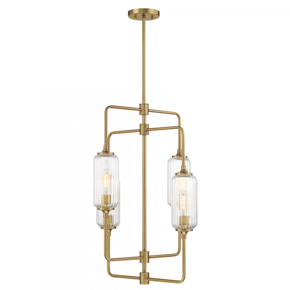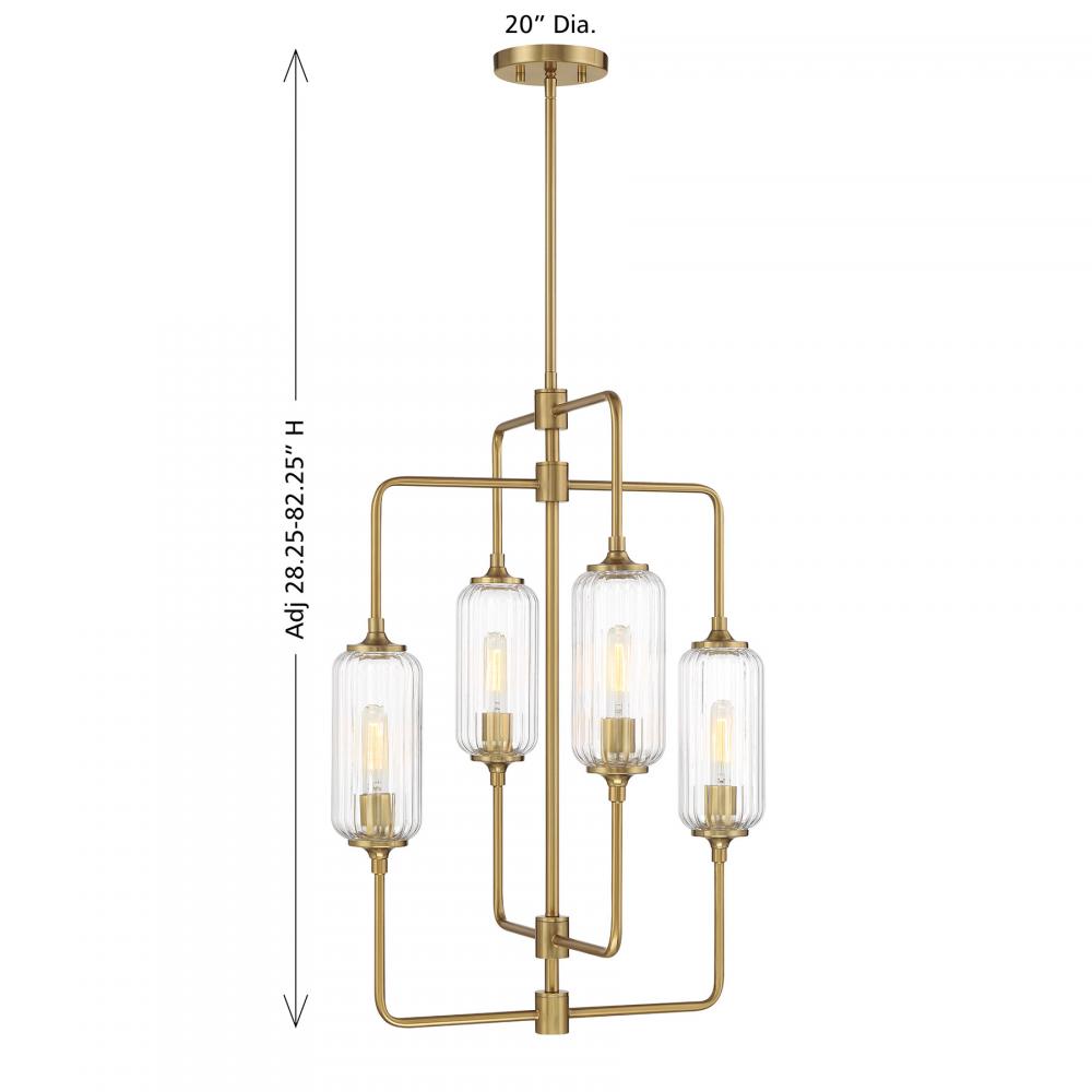 The Savoy House Holton 4-light foyer light showcases an inventive and geometric style with tall, rounded shades of clear ribbed glass and a slim, rounded structure finished in Warm Brass. It will bring a big dose of style to any space! Holton is 20" in width and has an adjustable height ranging from 28.25" to 82.25". It uses four standard size bulbs of up to 60 watts per bulb. Bulbs not included. Comes with four 12" downrods and one 6" downrod.