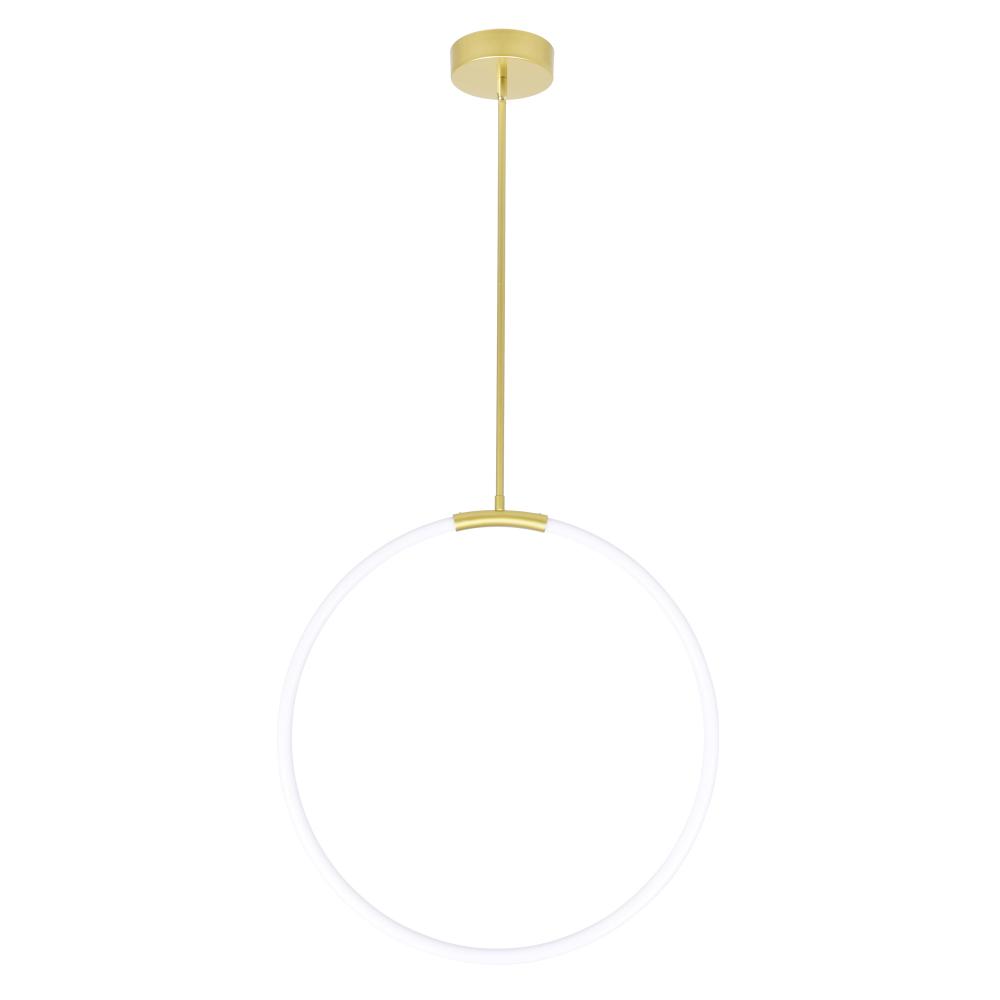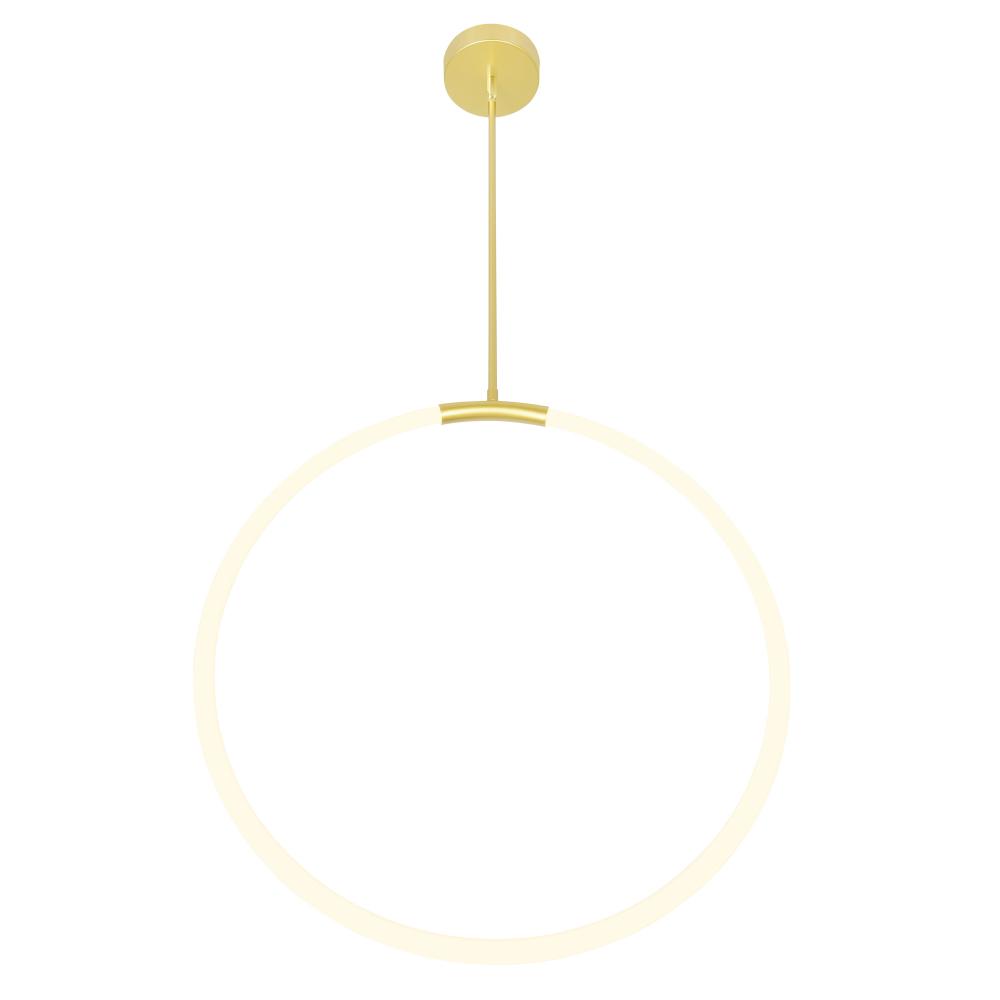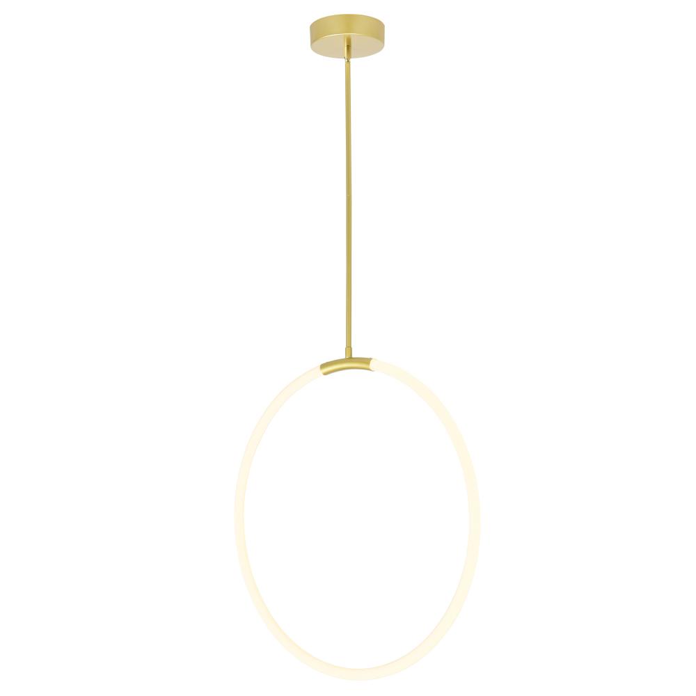 Make a bold, modern statement with the Hoops 24'' LED Chandelier in Satin Gold. With its sculptural silhouette, this contemporary pendant light features a single vertical LED ring suspended from a clean satin gold rod. Emitting a soft, ambient glow, this piece works beautifully in entryways, staircases, or any space that could use a touch of refined illumination. Its integrated LED technology ensures energy efficiency and long-lasting brightness, while its minimalist elegance brings visual interest without overwhelming the room. Finish: Satin Gold Light Count: Integrated LED Light Source: LED, No Bulb Required Adjustable Hanging Height: Yes Material: Metal and Acrylic Style: Modern / Minimalist / Geometric