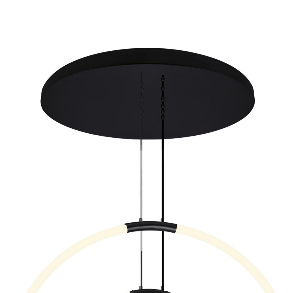 Modern Floating Ring Design: Features six LED-illuminated hoops suspended in an artful arrangement from a black canopy