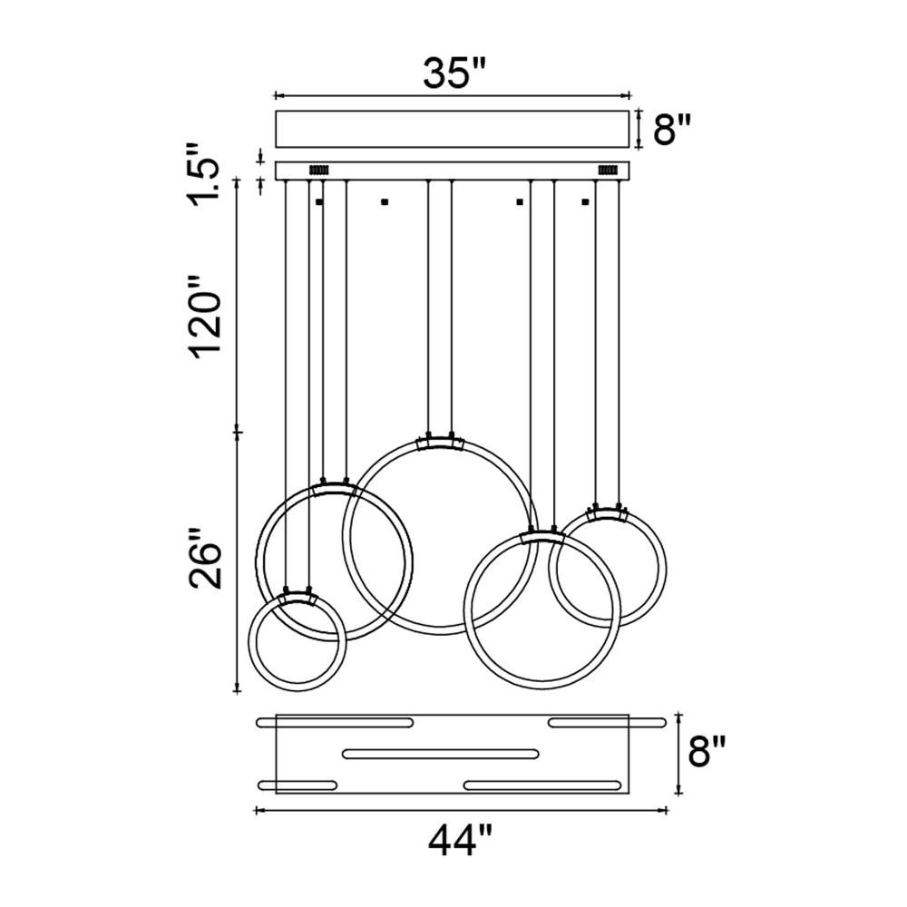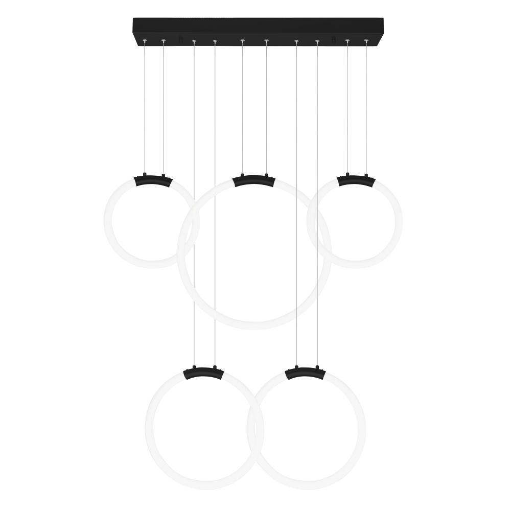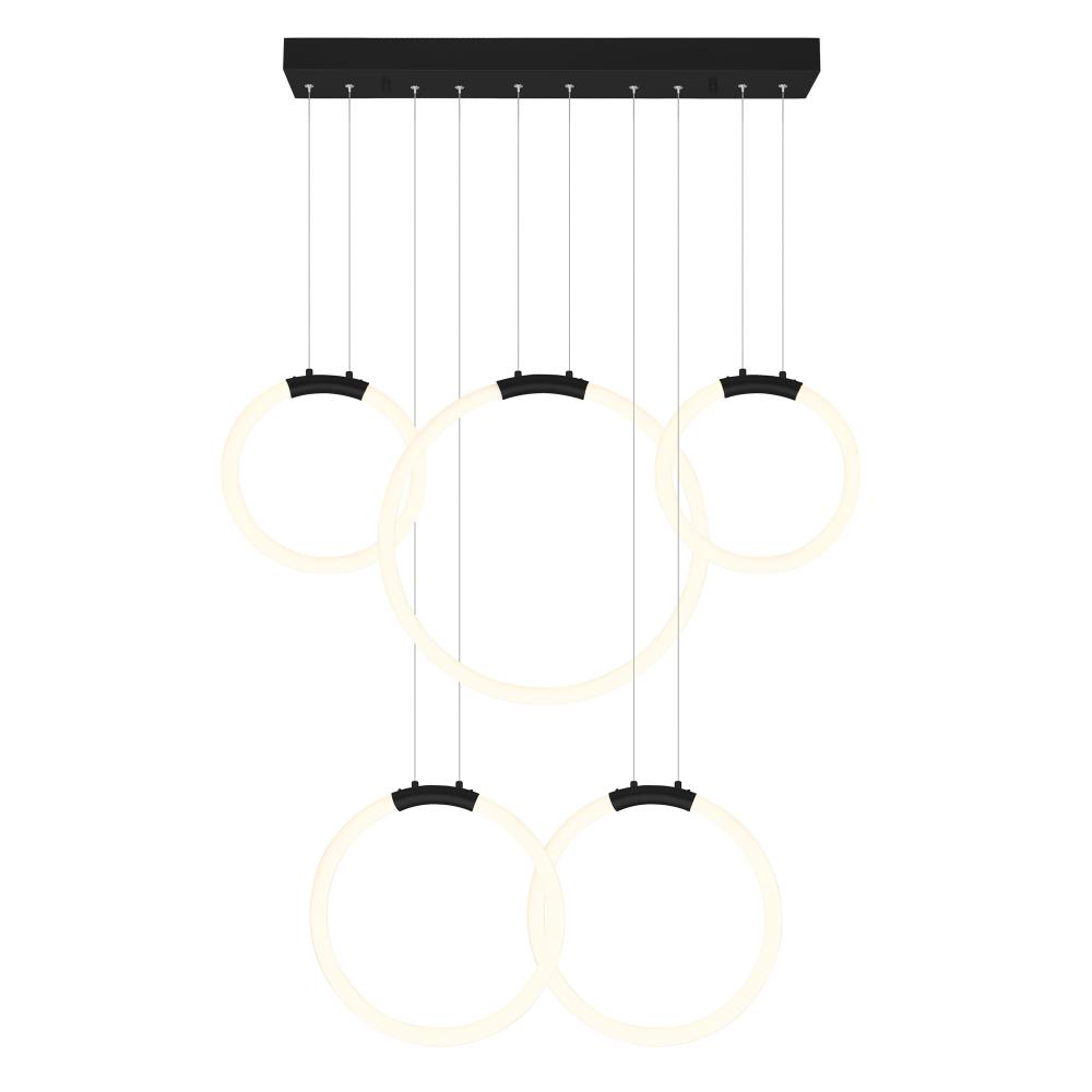 Make a bold lighting statement with the Hoops 44'' 5-Light LED Chandelier in Black. Designed for modern interiors, this multi-ring pendant fixture showcases five integrated LED rings cascading at varying heights from a minimalist rectangular canopy. The matte black finish offers dramatic contrast, while the suspended circular design provides architectural interest without overwhelming your decor. Whether in a double-height foyer, stairwell, or expansive dining space, this chandelier brings both brilliance and style to your home. Finish: Matte Black Light Count: Integrated LED (5 Rings) Light Source: LED, No Bulb Required Adjustable Hanging Height: Yes Material: Metal and Acrylic Style: Modern / Minimalist / Architectural
