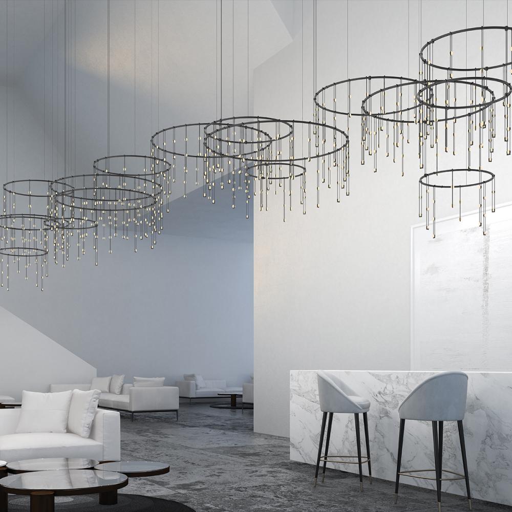 Suspenders Offset Ring System offers the ability to build a virtually limitless range of patterns and configurations of varying heights and widths. Shown here with Ladder Lights on Hangers of various lengths and Rings of various diameters, this spectacular, delicately-scaled Horizontal Matrix configuration expands its offset pattern across the expanse of the ceiling plane.