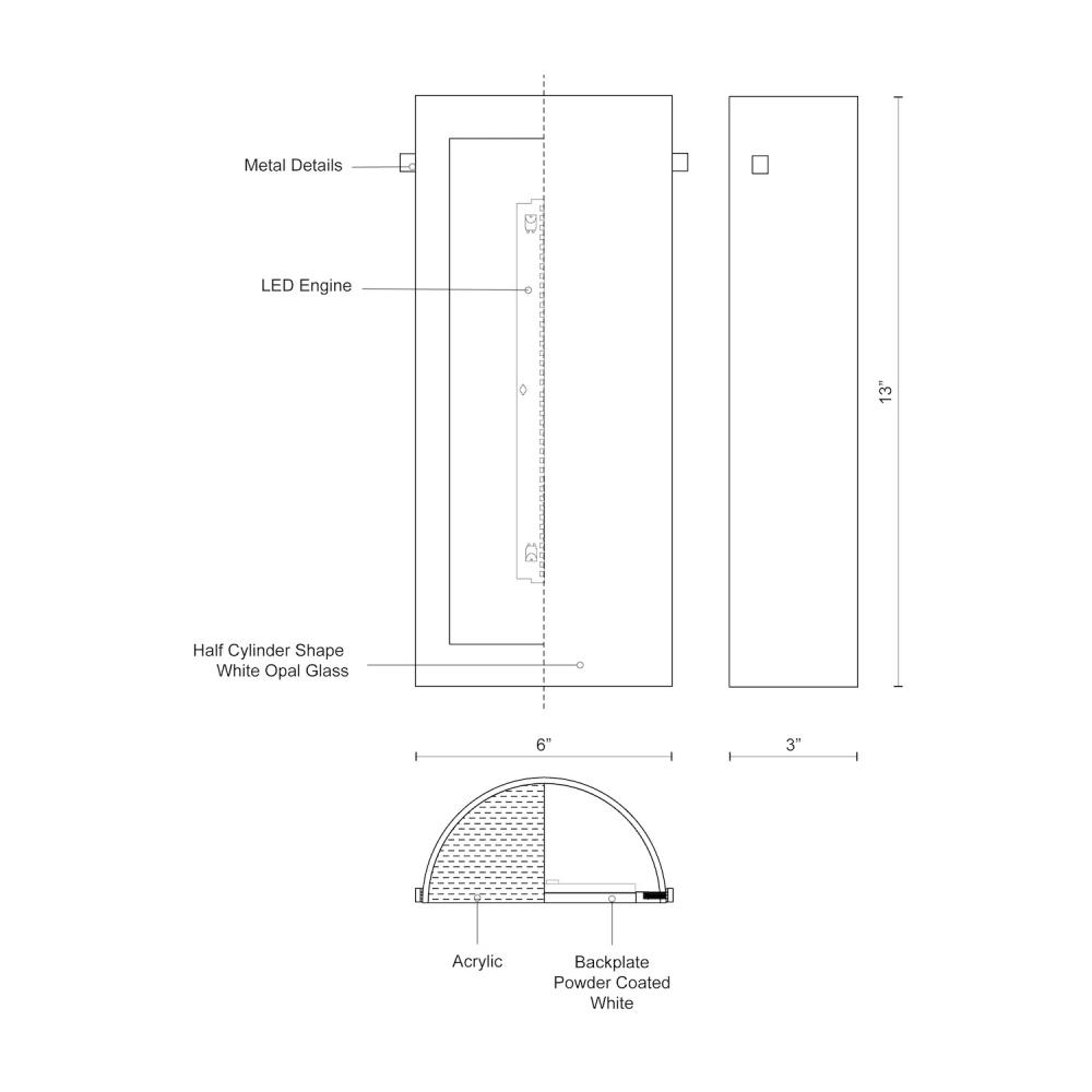 Single LED wall sconce with half cylinder shaped white opal glass. Metal details in brushed nickel and chrome finish, both decorative nut finish options included within fixture. Equipped with our powerful 12V AC LED technology