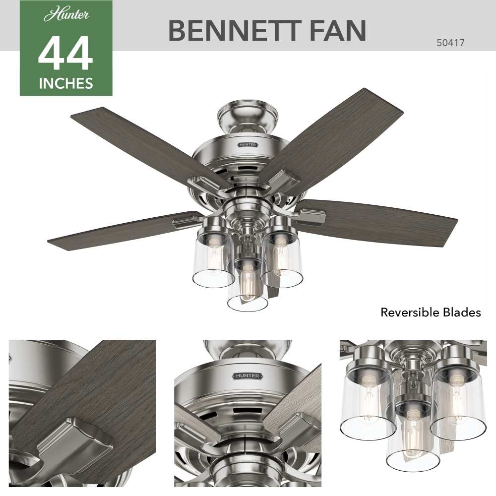 Regarded by homeowners and designers as one of our best ceiling fans, the renewed classic look of the Bennett ceiling fan adds a unique look to your space. The transitional design of this indoor ceiling fan makes it versatile: Use this small ceiling fan in a modern home office or Bohemian-style guest bedroom. The included handheld remote control makes it easy to adjust the fan speed and dimmable light.