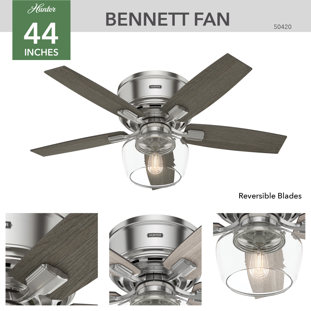 A modern take on classic ceiling fan design, the Bennett ceiling fan with LED light and handheld remote adds style to your small living spaces. The transitional design of this indoor ceiling fan makes a statement in various style rooms, from modern home offices to formal living rooms. Designed for rooms with low ceilings, the Bennett low-profile ceiling fan fits flush to the ceiling to ensure optimized airflow without sacrificing head space or style.