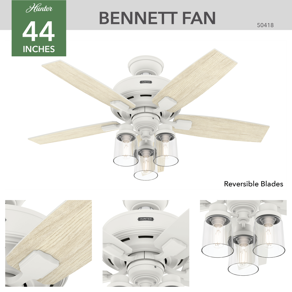 Regarded by homeowners and designers as one of our best ceiling fans, the renewed classic look of the Bennett ceiling fan adds a unique look to your space. The transitional design of this indoor ceiling fan makes it versatile: Use this small ceiling fan in a modern home office or Bohemian-style guest bedroom. The included handheld remote control makes it easy to adjust the fan speed and dimmable light.