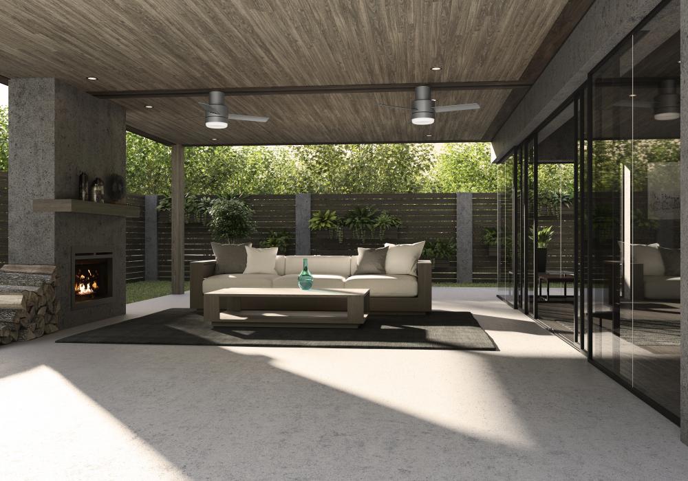 The Gilmour outdoor ceiling fan features a simple design and clean lines to complement your casual, modern covered porches and patios. The Matte White finish adds a bright, clean look while the Flat Matte Black finish adds a bold one. Use this fan indoors too! This small ceiling fan fits close to the ceiling to provide optimal performance in rooms with low ceilings without sacrificing style or headroom.