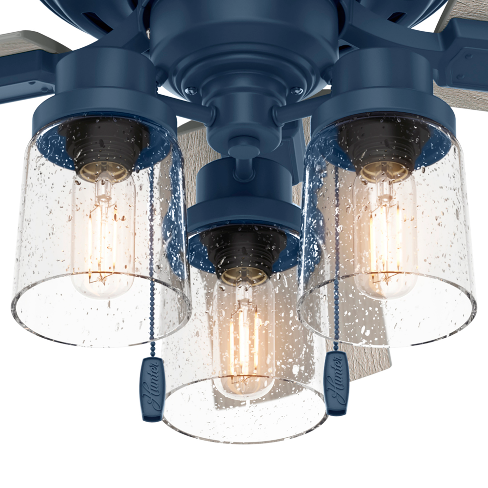 The Hartland chandelier-inspired ceiling fan’s clear-seeded glass and included Edison LED light bulbs create a stunning look in large spaces. The Noble Bronze and Matte Silver finishes complement other fixtures in a farmhouse, and casual spaces while the Indigo Blue finish adds a subtle pop of color. This indoor ceiling fan is designed to fit flush in small rooms with ceilings less than 9 feet high. Create a cohesive look in your space by pairing the Hartland ceiling fan with the coordinating light fixtures in its collection.