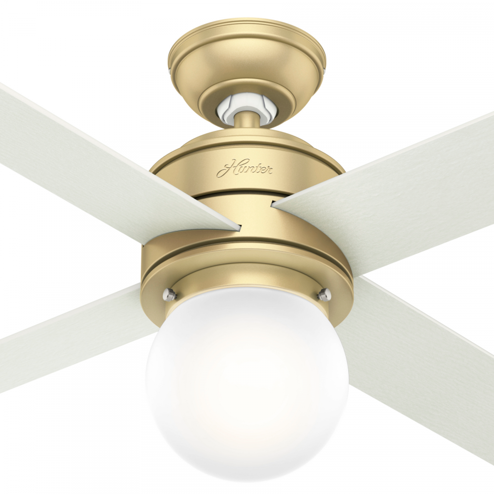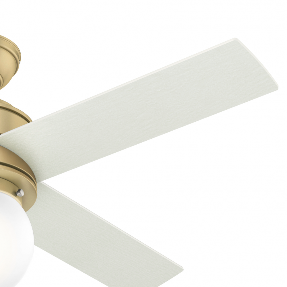 With its vintage-inspired round globe light, the Hepburn?s design captures the essence of the 1920s while embracing modern touches. Create the ideal ambiance with the energy-efficient, dimmable LED bulb and get whisper-quiet performance and ultra-powerful air movement with the reversible, three-speed WhisperWind? motor. The contemporary finish will fit famously in your formal yet modern bedroom, but the simplicity and thoughtful proportions of the Hepburn chandelier ceiling fan will make it the perfect centerpiece of any space! The Hepburn modern ceiling fan is available in a variety of finishes including Modern Brass and Satin Copper.